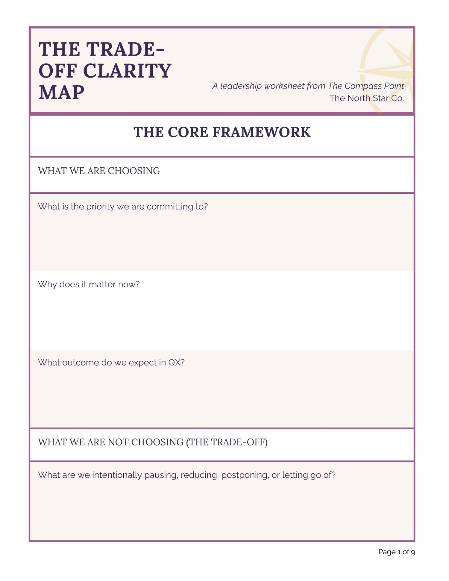 The Trade-Off Clarity Map guides you through the decisions that matter most: what you are choosing, what you are not choosing, and why those choices strengthen your team’s focus and execution.