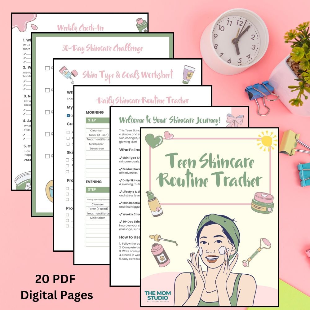 The Teen Skincare Routine Tracker Bundle is a 20-page digital guide that takes the guesswork out of skincare. It helps teens understand their skin, track what works (and what doesn’t), and build an easy, effective routine they can actually stick to. No more wasted money on products that irritate their skin. No more frustration over what to use and when.