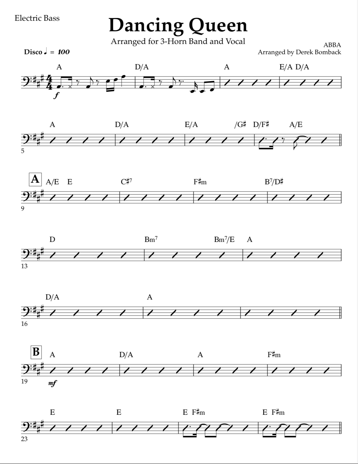 Dancing Queen by ABBA. Key of A major. Arranged for 3 horn band and vocal (Trumpet, Alto Sax, Trombone, Guitar/Keys, Bass Guitar, Drums & Vocal Score).
