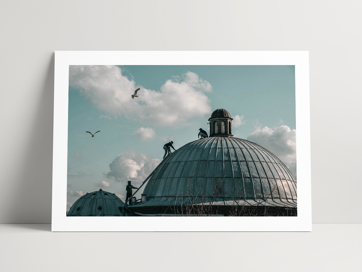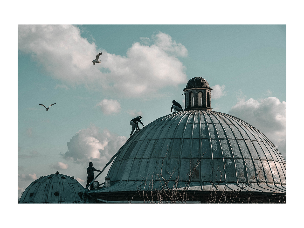Ce jour-là, mon regard a été attiré par une scène inattendue : trois travailleurs perchés sur l’un de ces dômes arrondis qui façonnent la silhouette si reconnaissable de la ville. L’un maintenait une échelle, le second la gravissait avec précaution, tandis que le troisième guidait son arrivée au sommet. Une chorégraphie précise, presque silencieuse, suspendue entre ciel et architecture.