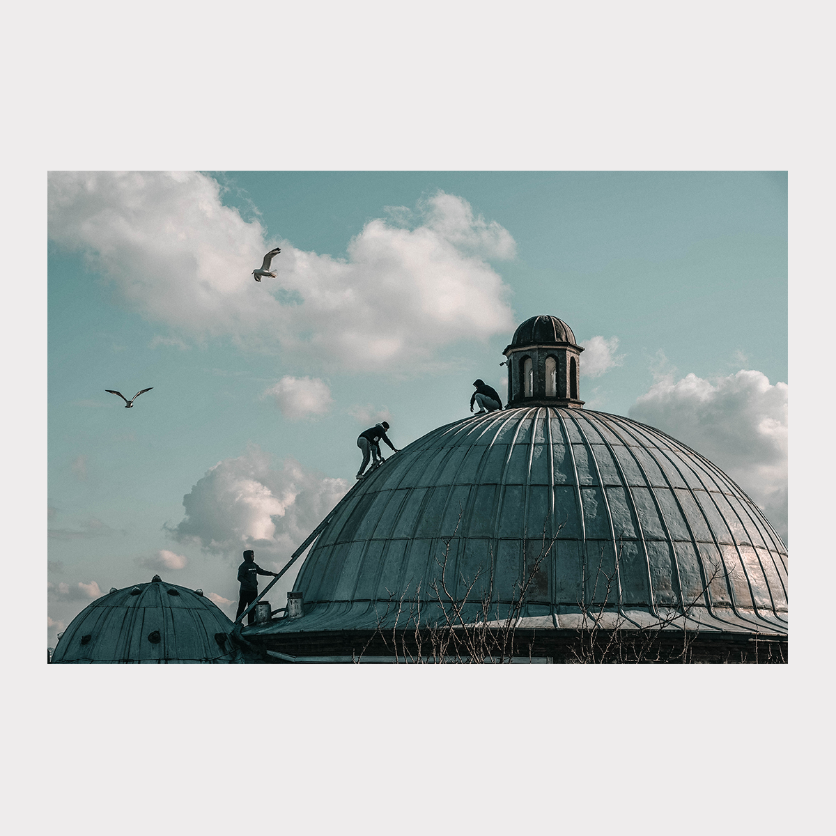 J’aime particulièrement les tonalités monochromes qui unifient la photographie — le bleu du toit répondant au bleu du ciel — laissant les silhouettes humaines devenir le véritable point d’ancrage du regard. Ces hommes incarnent pour moi une facette essentielle d’Istanbul : une ville immense, vibrante et tentaculaire, où derrière l’effervescence quotidienne, certains travaillent discrètement à préserver son héritage.