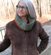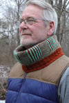 Grandpa’s Barn Cowl is a reversible unisex accessory that is worked from the bottom up and in the round. It starts with 2 x 2 ribbing and progresses into a two-color garter stitch border followed by alternating sections of garter stitch and brioche ribbing. A few rounds of garter stitch are then worked around the entire cowl. The final section of garter st and Brioche ribbing is offset from the first for visual interest. The cowl ends with one last border of garter stitch that’s finished with one color 2 x 2 ribbing.