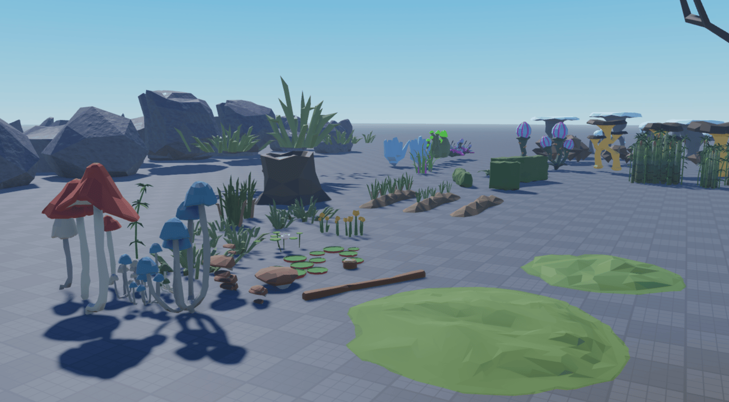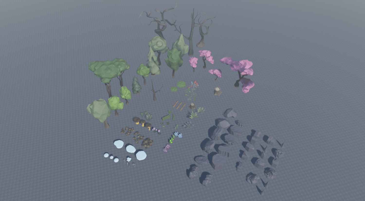 Low Poly Nature Pack features a variety of stylized, low-poly nature assets, including different types of trees, bushes, grass, flowers, rocks, and terrain elements. The pack also includes modular parts like customizable terrain shapes and rock variations to modify the landscape for unique gameplay.