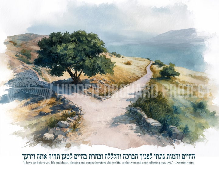 Featured in this print are the timeless words of Deuteronomy 30:19, "I have set before you life and death, blessing and curse; therefore choose life, so that you and your offspring may live."