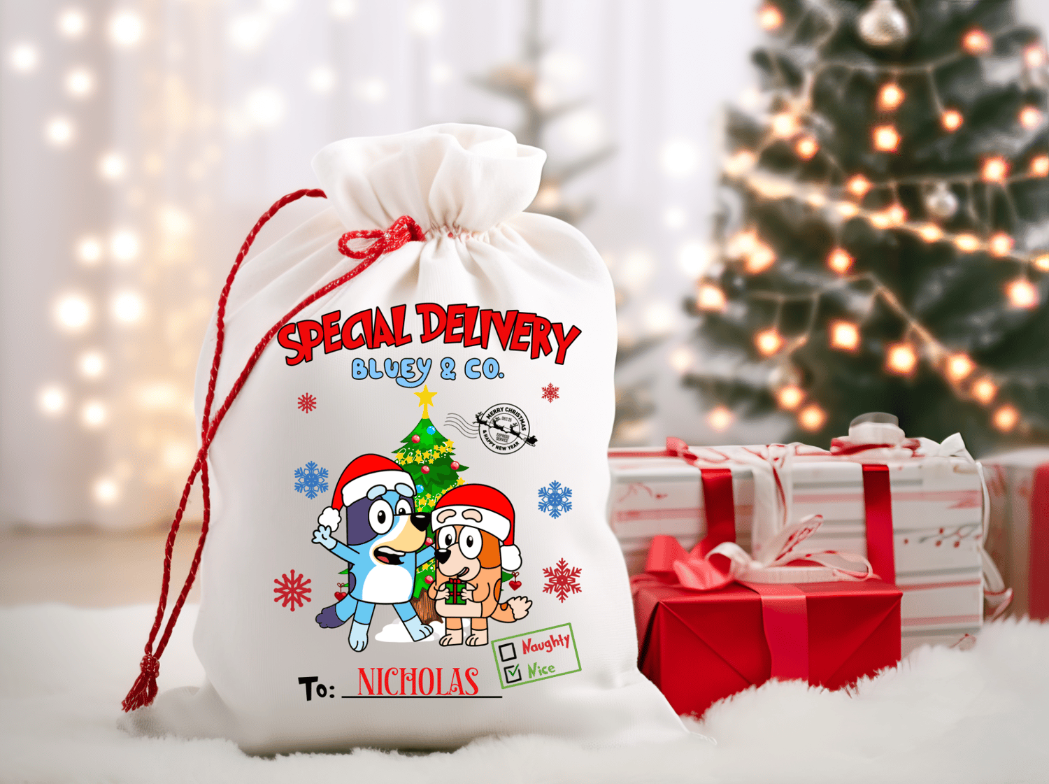 Make Christmas morning unforgettable with our Bluey Special Delivery Santa Sacks! Featuring a charming design inspired by the beloved Bluey characters, these festive sacks are perfect for holding presents, treats, and holiday surprises. Made from durable materials with plenty of space, they’re a fun and practical way to bring extra joy to your little ones this holiday season. Reusable and adorable, these sacks add a magical touch to any Christmas celebration!