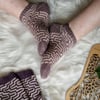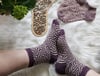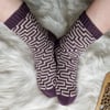 Daedalus DK socks are knitted in the round, cuff down with a heel flap and gusset, OR Toe up with a shadow wrap heel.