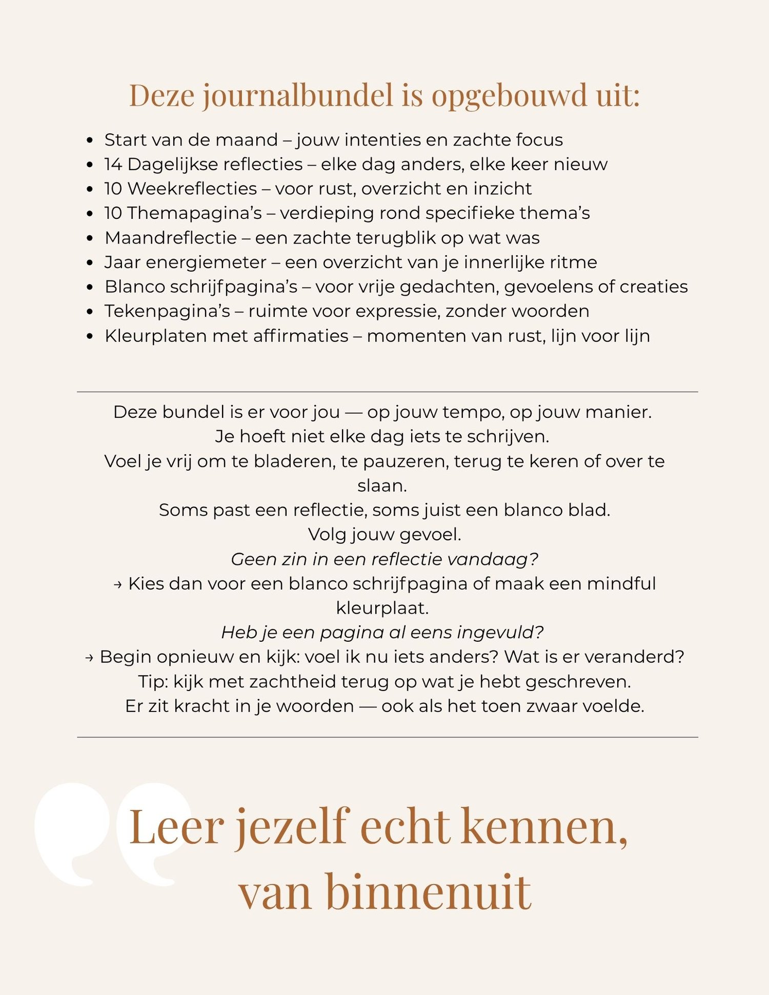 De bundel bevat meer dan 40 zorgvuldig vormgegeven journalingpagina’s die je helpen om stil te vallen, te voelen, te reflecteren en te helen: