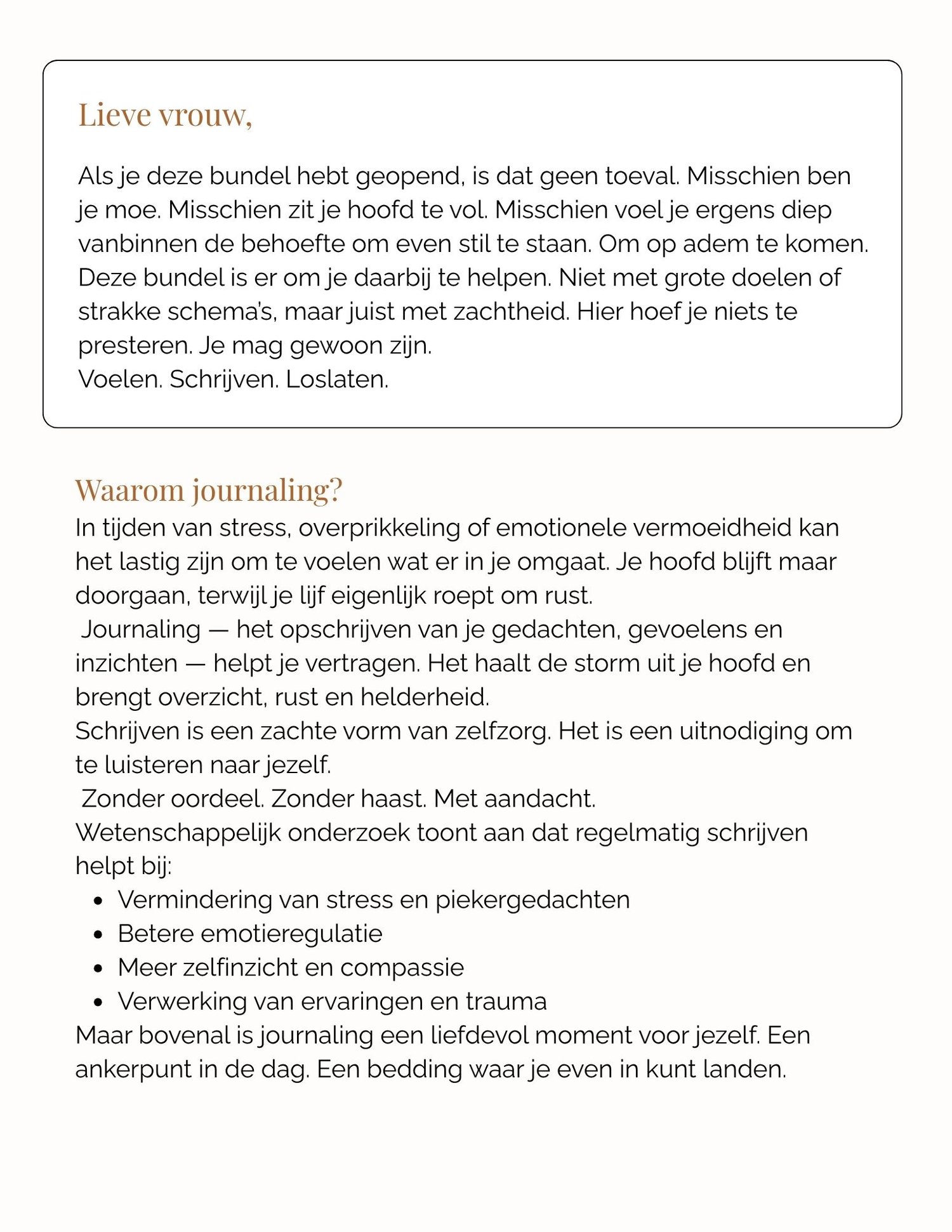 Deze journalbundel is jouw pauzeplek. Een plek waar je niets hoeft op te lossen, maar wél mag landen. Met liefde ontwikkeld voor vrouwen die zich vaak verliezen in moeten, zorgen en denken — en die weer thuis willen komen bij zichzelf.