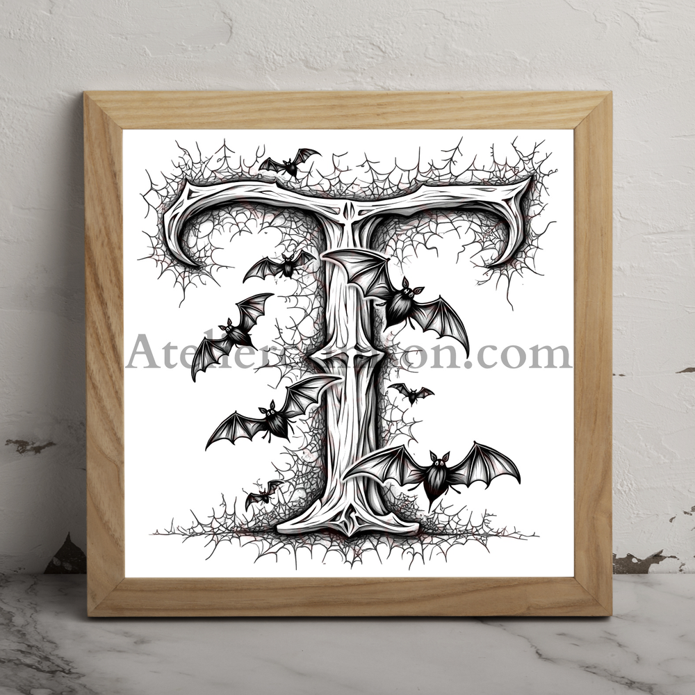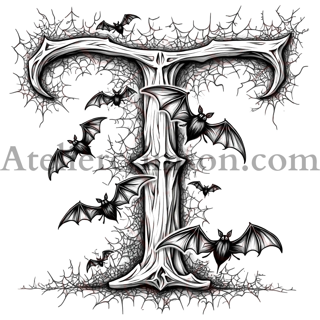The letter T coloring book halloween occupying 90% of a 1024x1024 image. Use an Old English font style with clear outlines resembling a coloring book page. The character is composed of intricate bat silhouettes, creating a spooky Halloween atmosphere. Use only pure black (#000000) for the character and outlines, and white for the background.2D, black and white style resembling a high-quality adult coloring book page.
