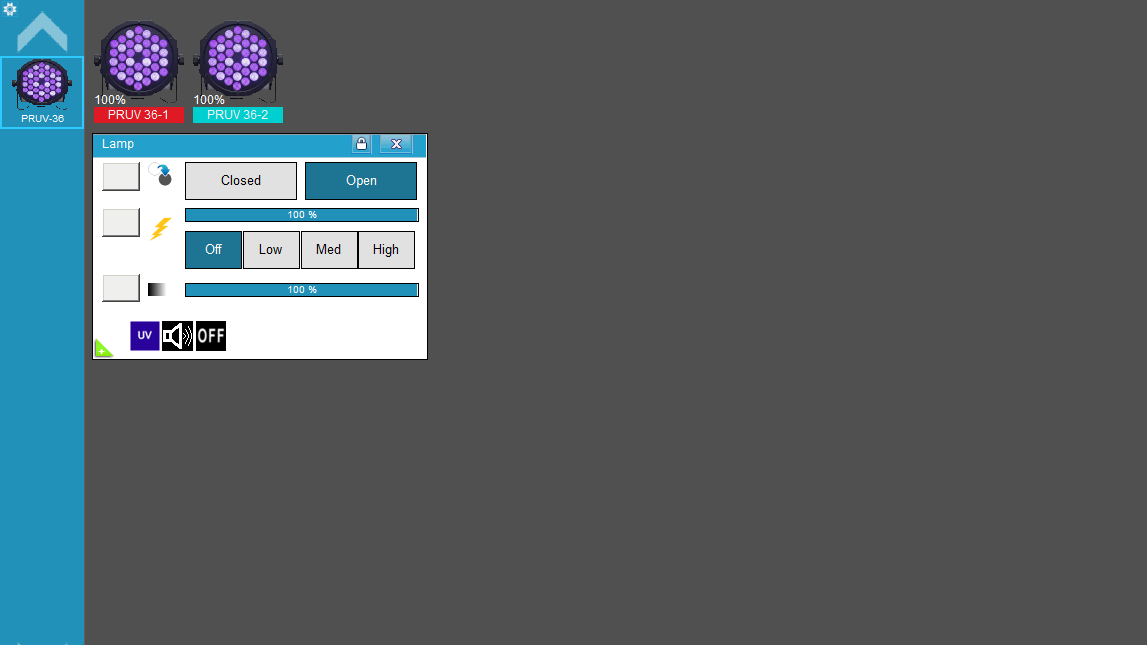 * Verifique, con un Fixture de pruebas (click), que coincidan estos canales: 1 Dimmer, 4 UV, 5 Strobo.