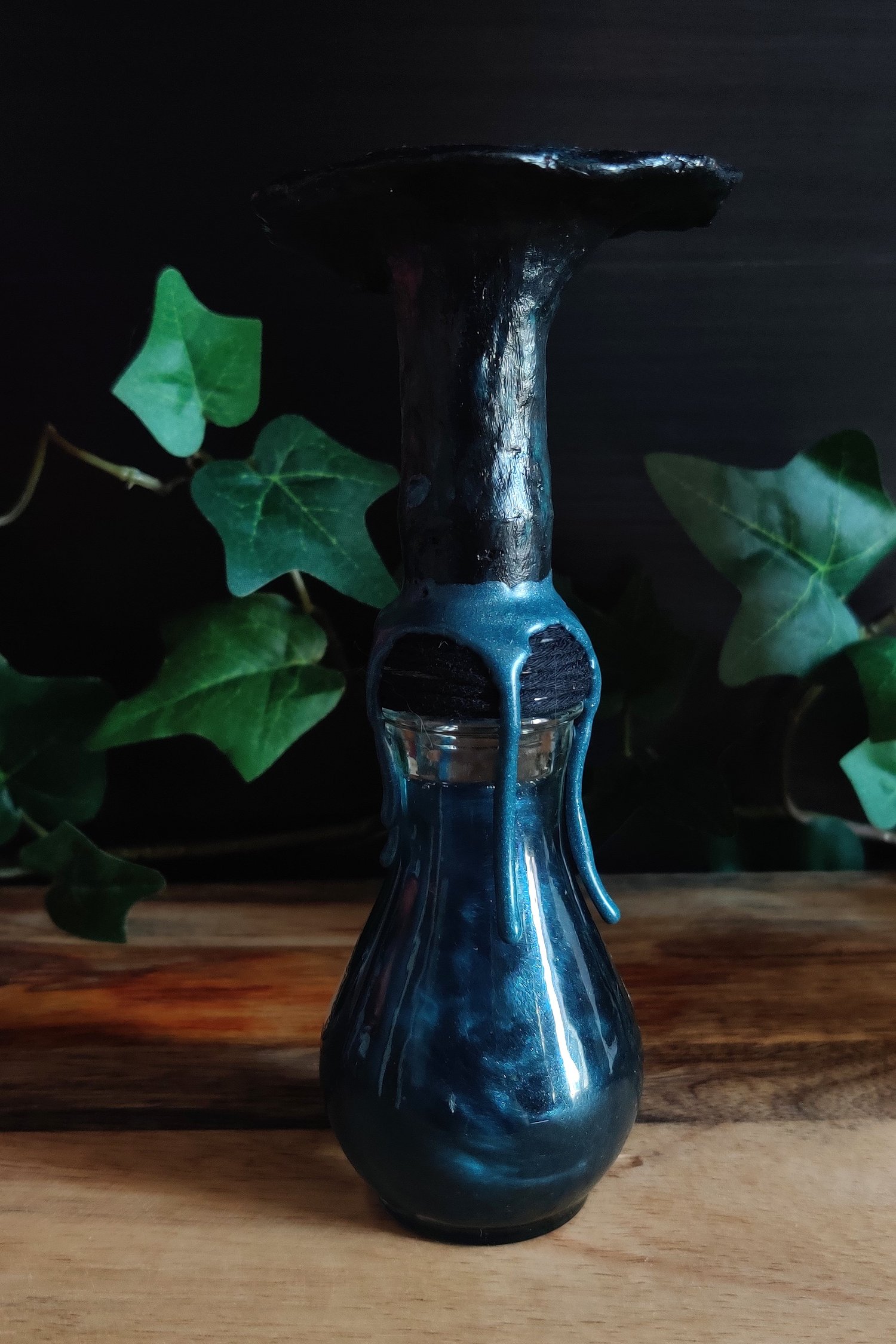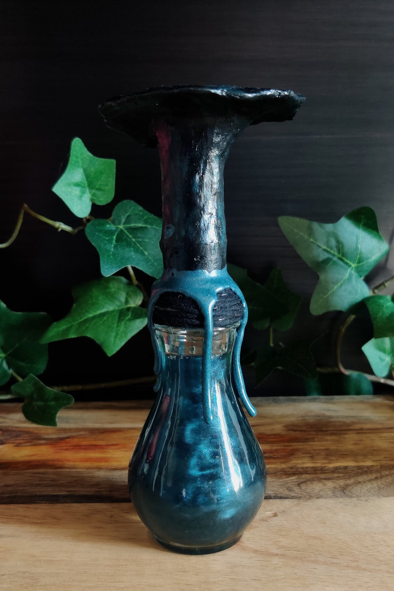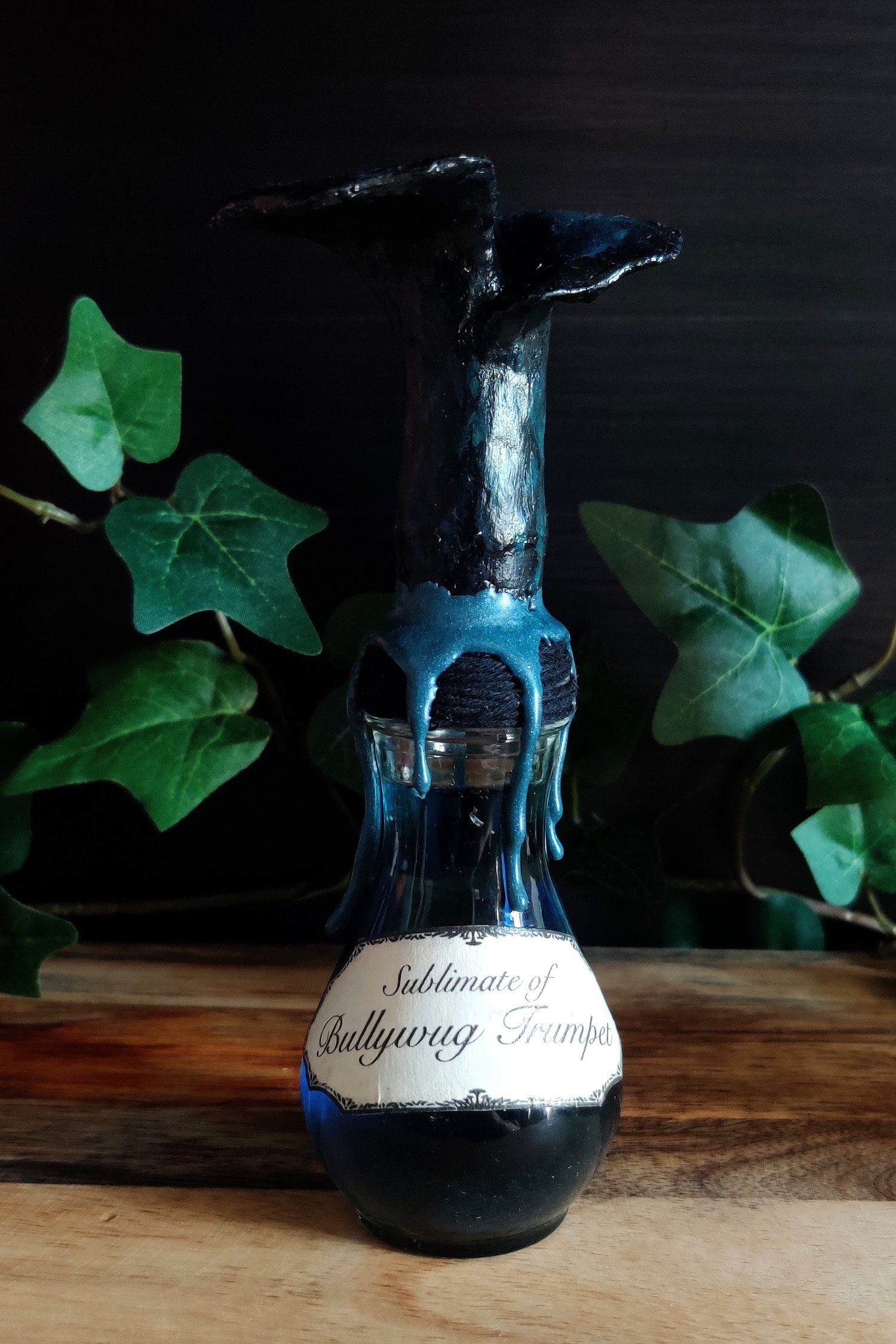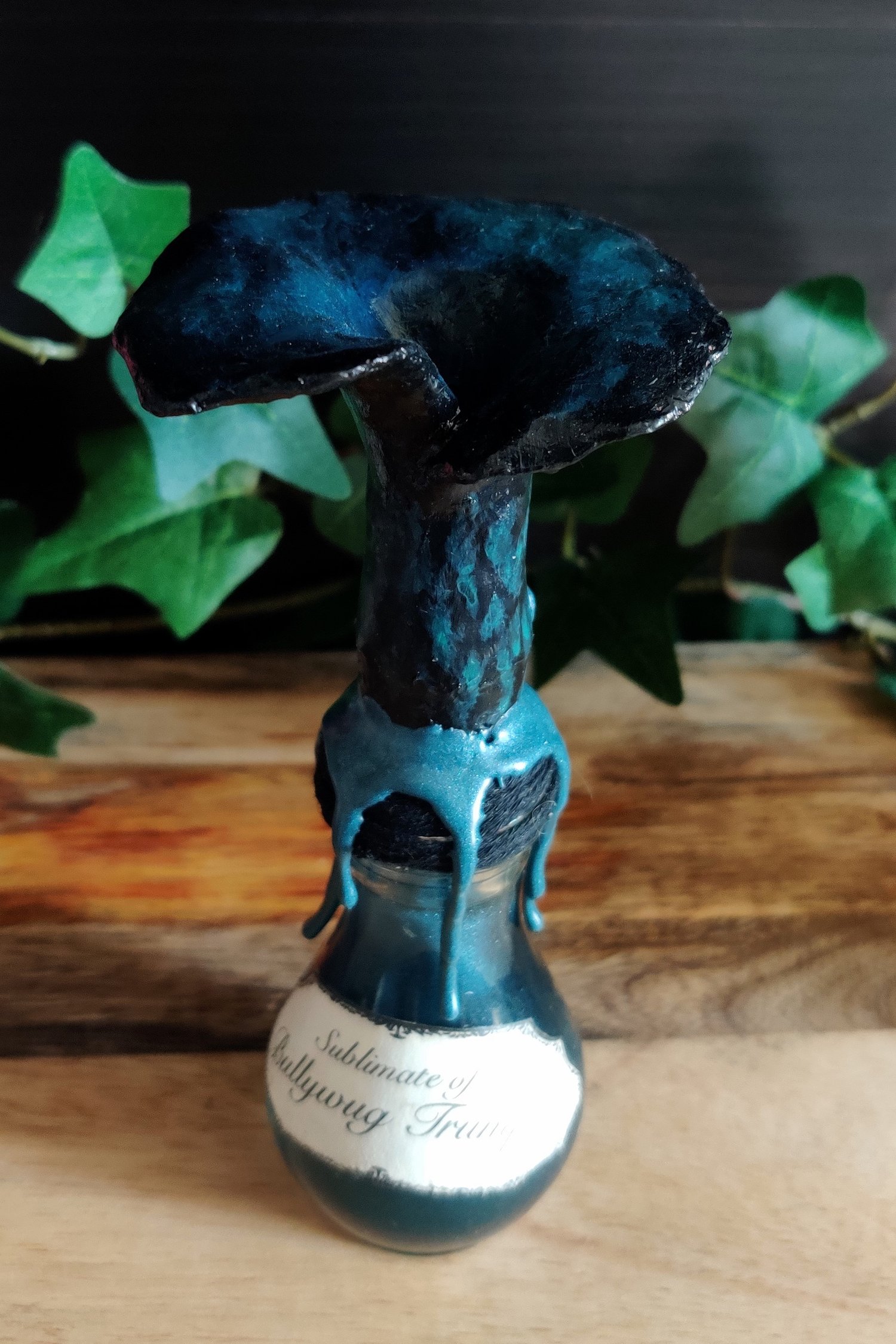 Pullossa on sinimustaa nestettä ja se on koristeltu käsintehdyllä etiketillä ja nauhalla. Pullon päällä massasta muotoiltu sieni ja kaulalla sinettivahaa.