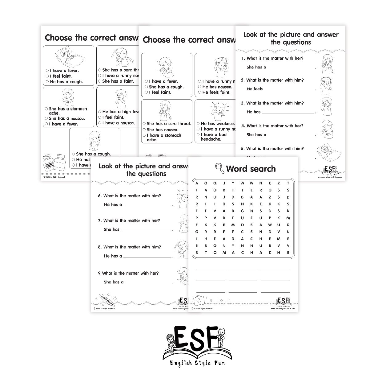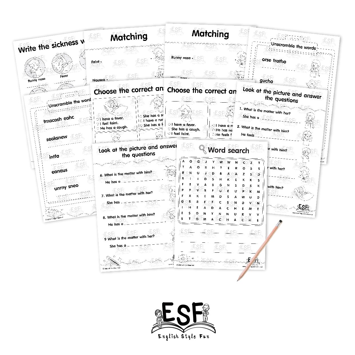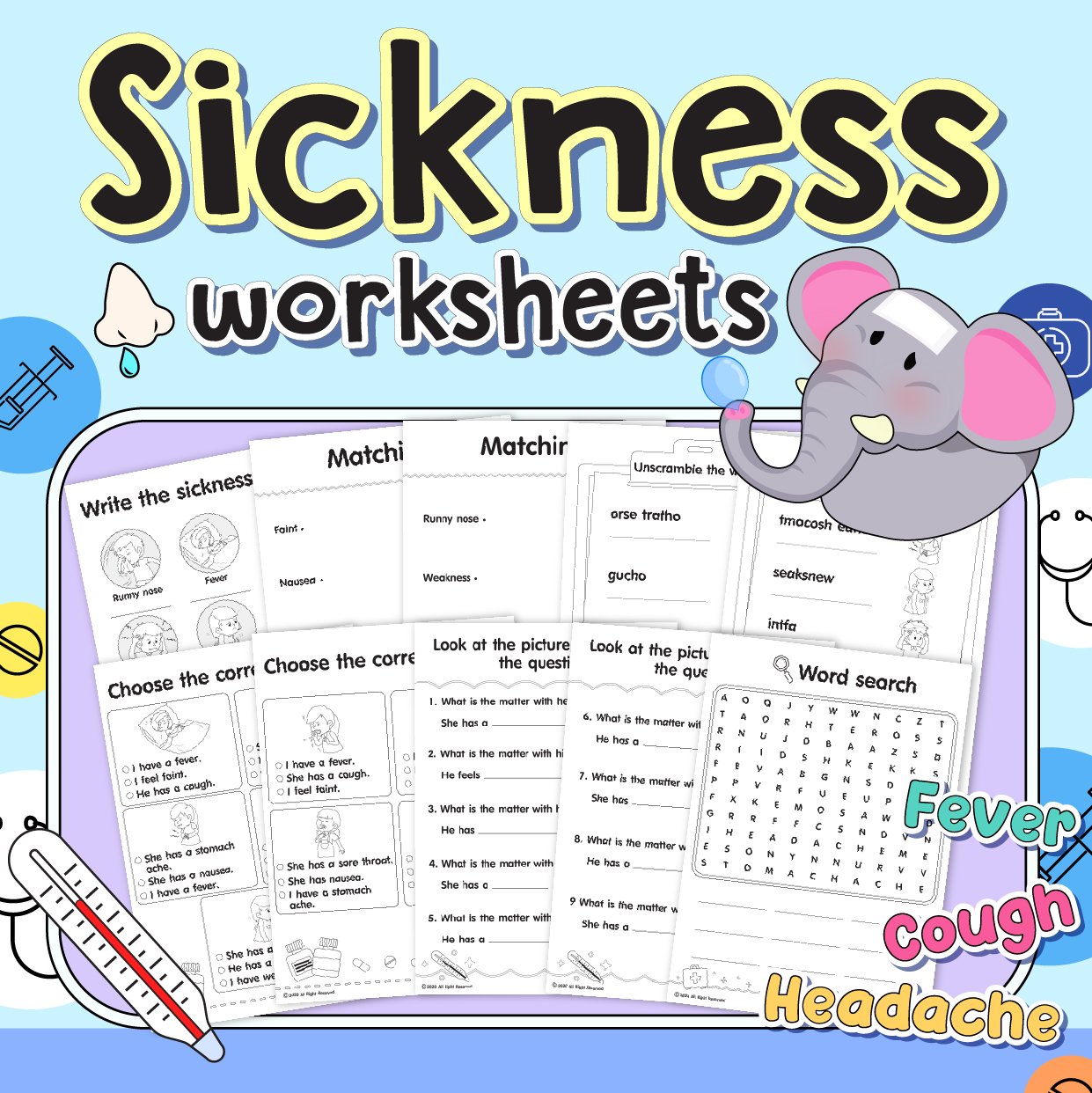 In this set of worksheets the student will learn the basic terms for illnesses such as: runny nose, fever, coughing, headache, weakness, sore throat, faint, stomach ache and nausea. They will learn through writing, matching, unscrambling, choosing, fill in the blank, and searching. I tried to make the worksheets look fun to keep them focused and not bored at the same time.