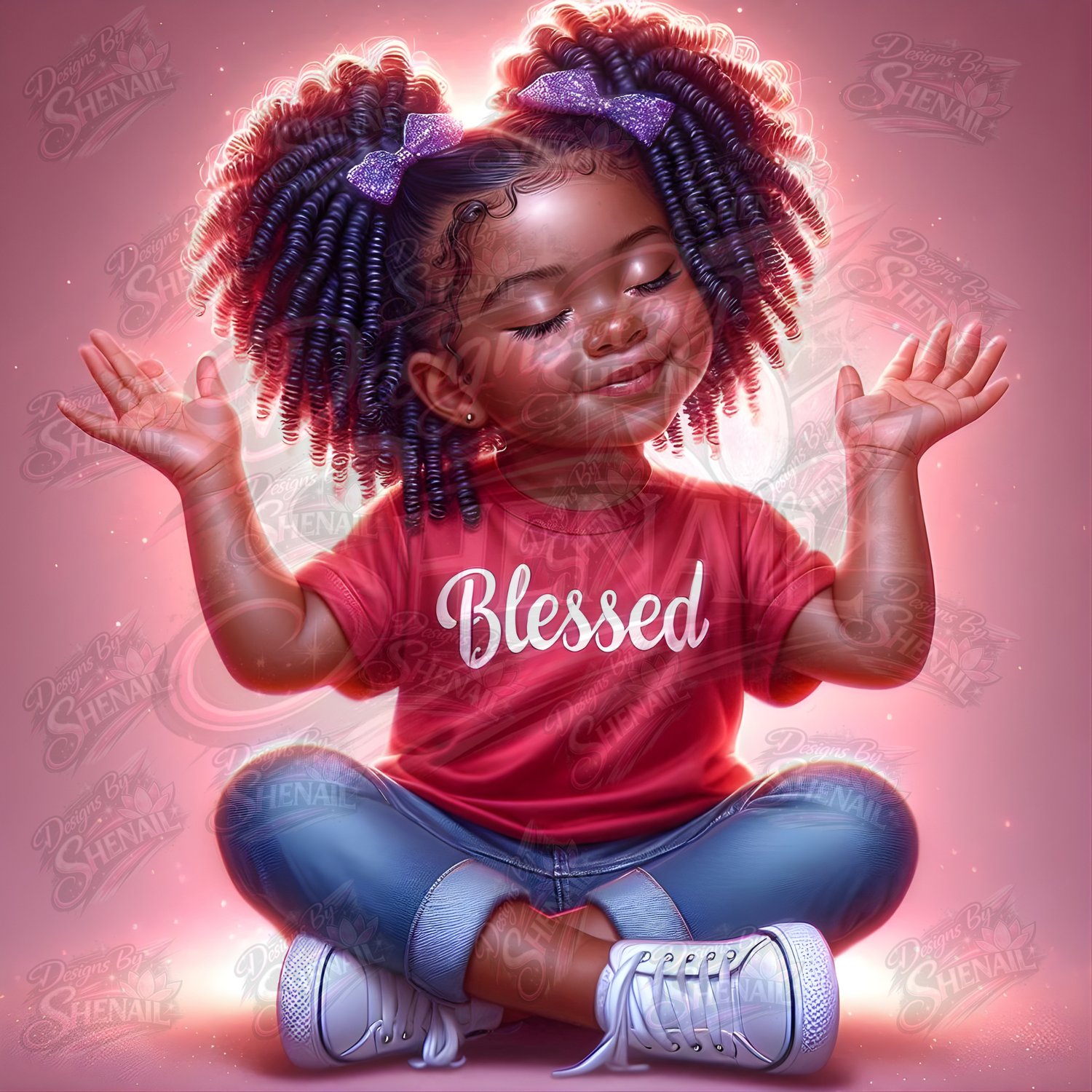This “Blessed” baby girl clipart is a heart-melting, faith-inspired digital illustration featuring an adorable little girl with beautiful afro puff ponytails, soft glow lighting, and a peaceful, joyful pose. Perfect for creating kids apparel, nursery decor, faith-based designs, and handmade gifts.