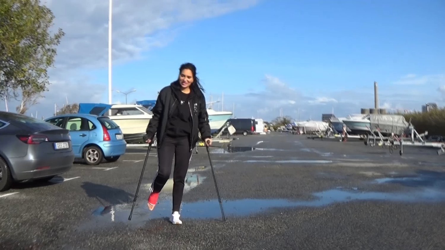 Crutching from the car on her way to the park, Flower is wearing black training pants as it is right now the only thing she can wear as her right leg is in a red short leg cast.After a while she sits down on a bench and puts up her injured leg which makes it possible for us to film it in close-up from different angles