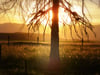 The sun setting on a farm in the South Island of New Zealand. The sun shining through the bare branches of the tree during the winter creates a beautiful golden glow.