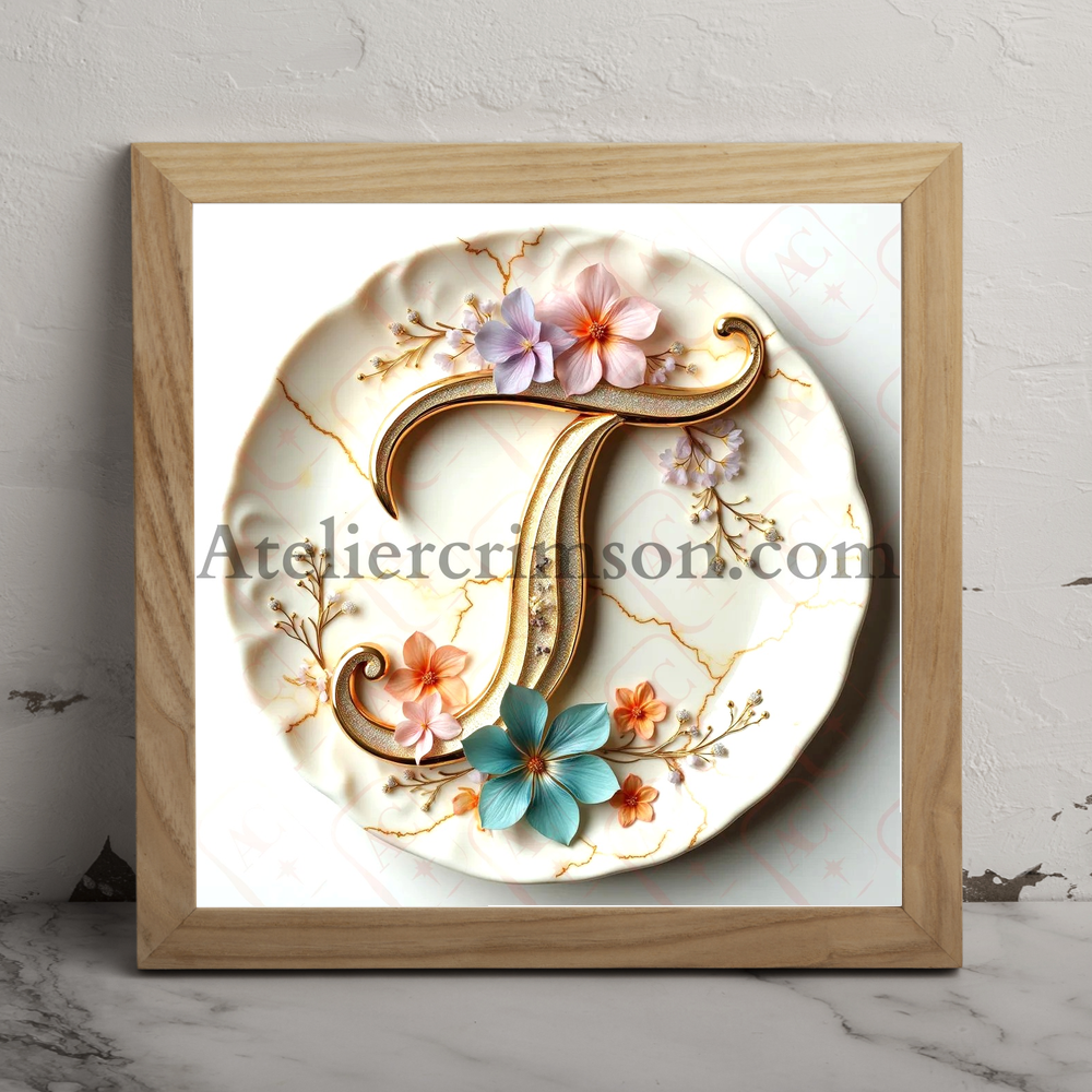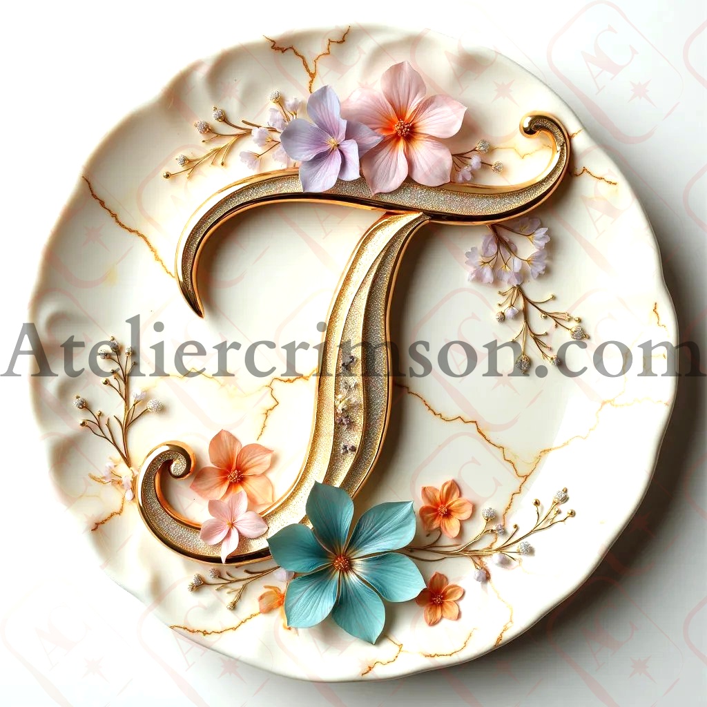 The letter T flowers and procelaine .Download Now this high quality AI-generated image, perfect for adding a touch of tranquility and creativity to any space.