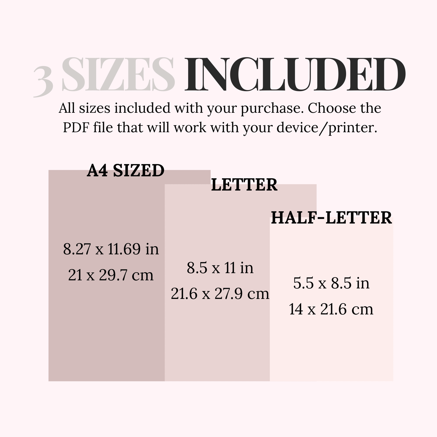 ✨3 Sizes: A4 (8.3” x 11.7”), Letter (8.5” x 11”), and Half Letter (5.5” x 8.5”)