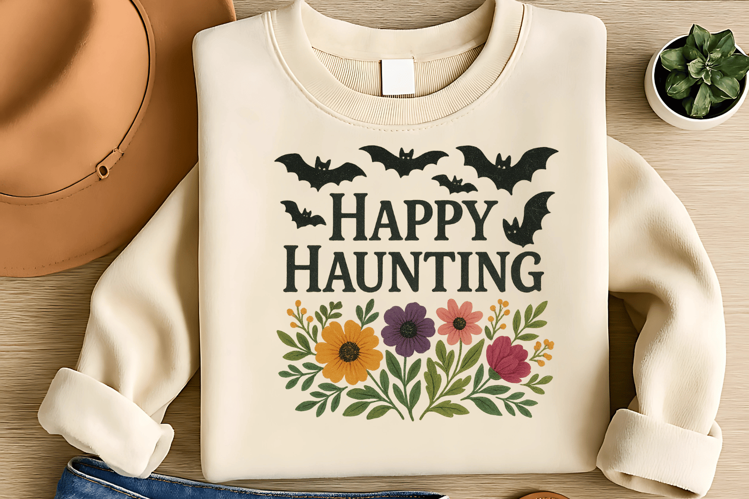 Spooky Bloom Bats Sublimation PNG – “Happy Haunting” Halloween T-Shirt Clipart – Creepy & Floral Fusion – 300 DPI Instant Digital Download