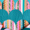 When It Rains is a jelly roll friendly bold clamshell quilt pattern. The big pieces and alternate block construction make this a great pattern for beginners to curved piecing. The pattern includes detailed step-by-step instructions and illustrations, a coloring page, and full-size printable pattern template pages.