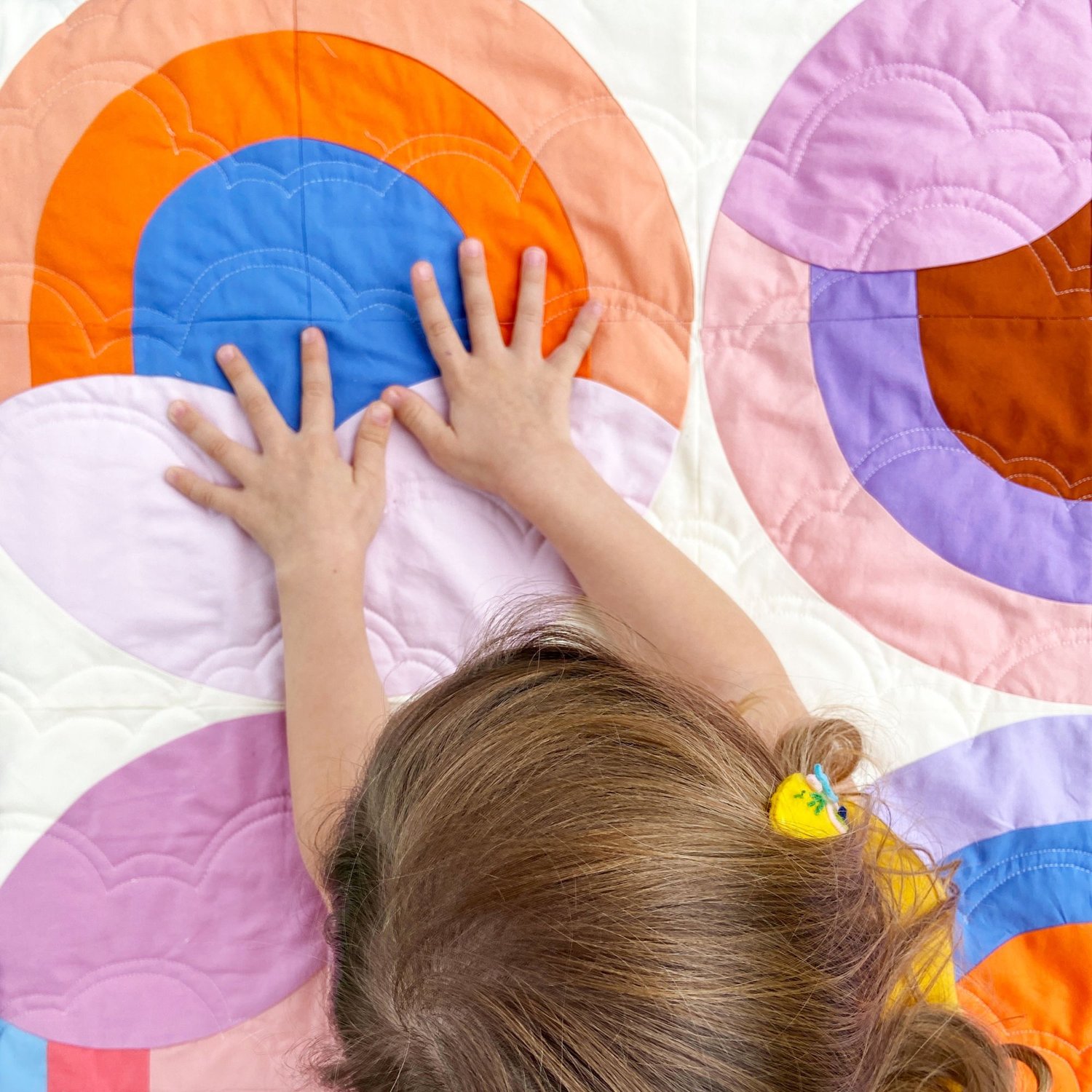 Let’s make rainbows! Rainbow Sky is a cheerful modern quilt pattern featuring curved piecing. The pattern includes charts and directions for an alternate layout, as well as fabric requirement charts for making the rainbows from fat quarters, half yards, or scraps. There are so many ways to make this quilt reflect your unique style and fabric stash!
