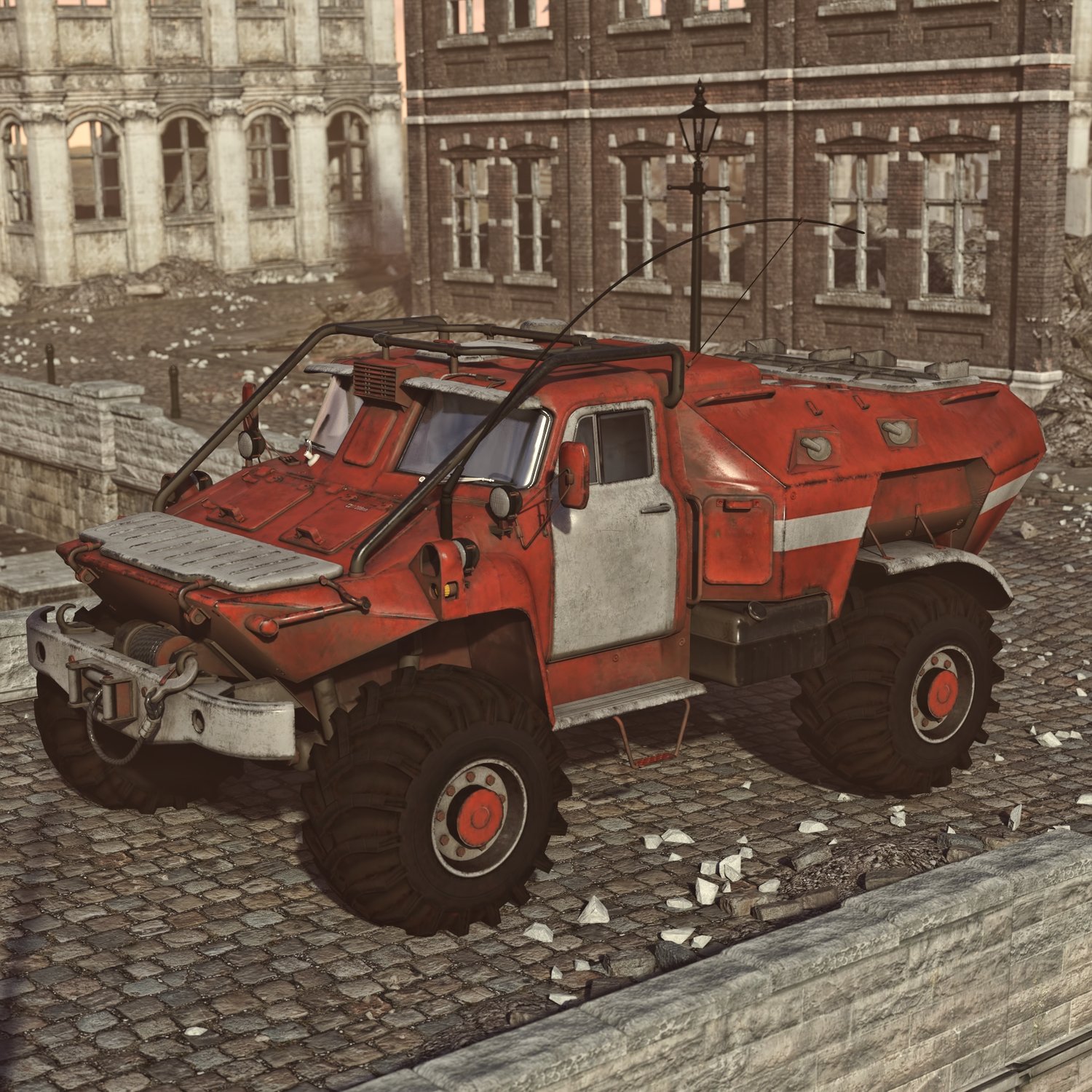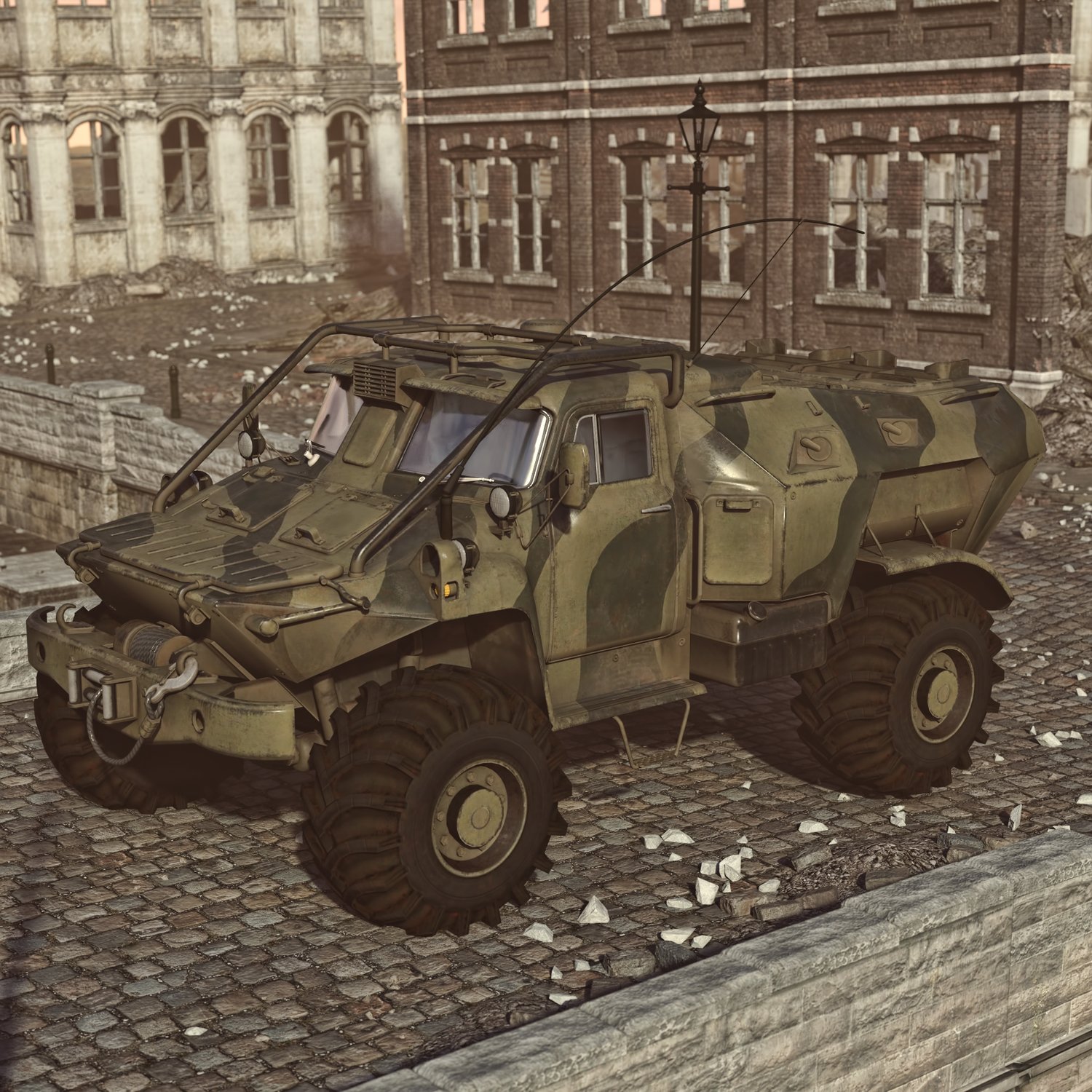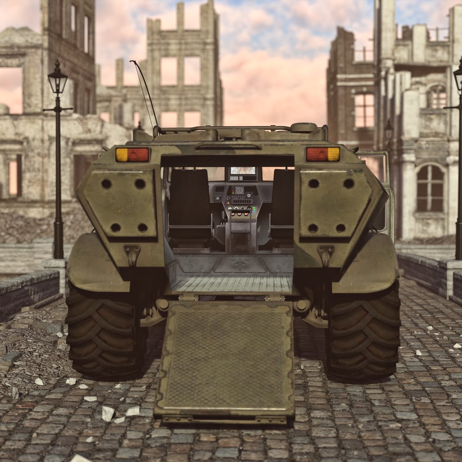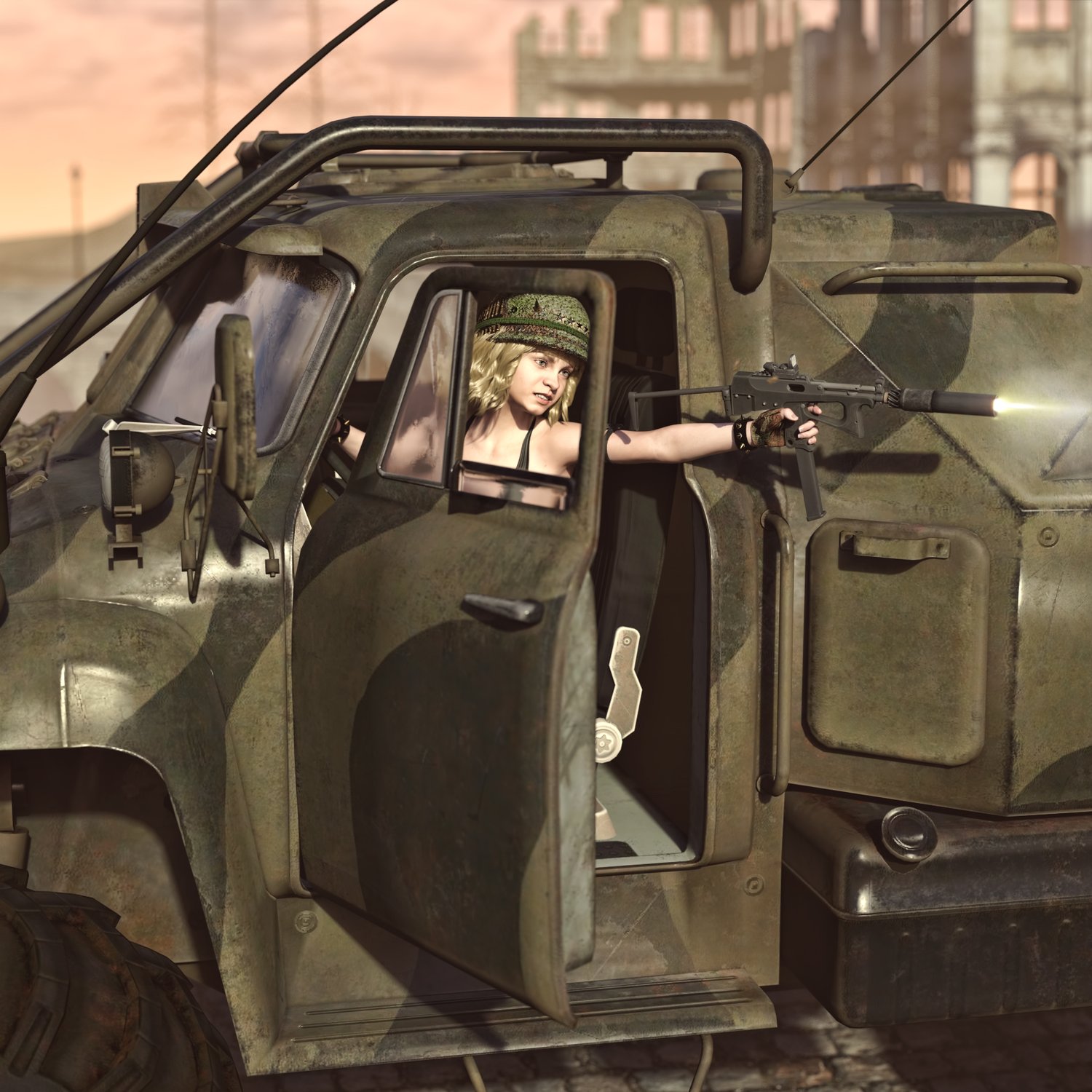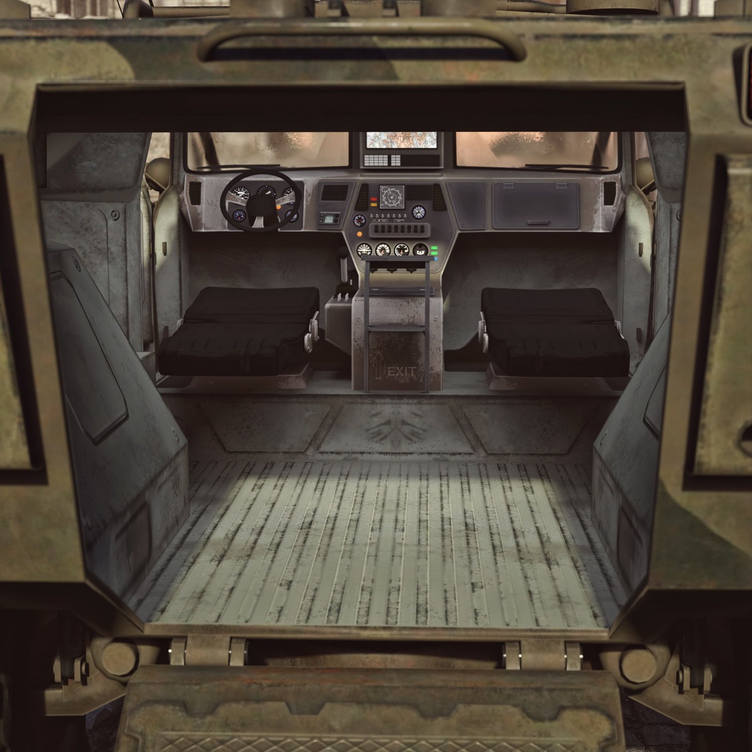 Armored vehicle for transporting your special operations units. Rear door for fast dismount from the back. Good for transportation and for combat with lightly armored enemies. You can also take your friends with you- it has some space. Front seats backs are also rigged… for no reason at all… Windows are also rigged so you can lower them or hide (need to be adjusted manually). Converted and rigged for DAZ.