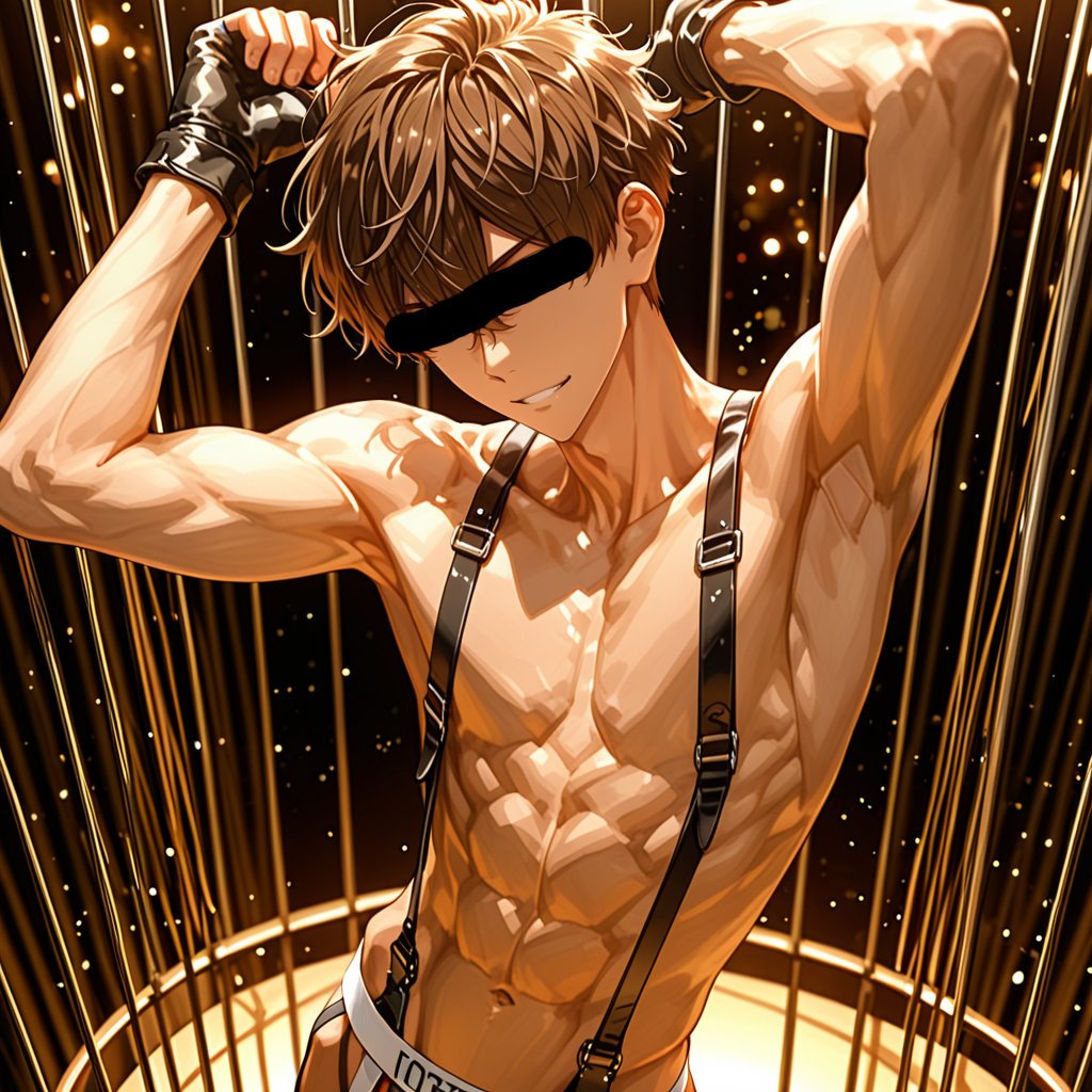 男性ショーダンサーをテーマに、ジョックストラップとサスペンダーを着せて、ポールと鳥かごをテーマに、キャラクターの魅力を存分に表現しました。