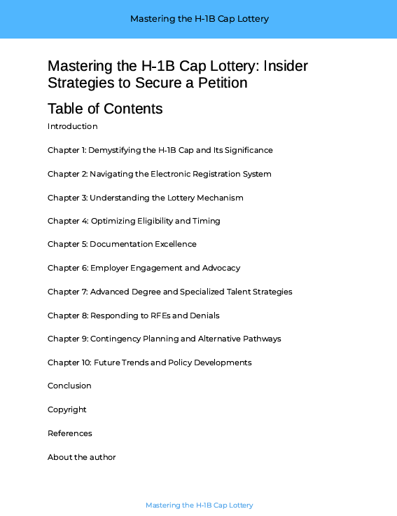 "Mastering the H-1B Cap Lottery" equips employers and candidates with essential strategies to navigate the complexities of the H-1B visa application process. By optimizing filing timelines, ensuring accurate documentation, and leveraging statistical insights, this guide enhances the likelihood of selection in a competitive landscape. With a focus on compliance and innovative filing techniques, it empowers organizations to transform challenges into strategic advantages.