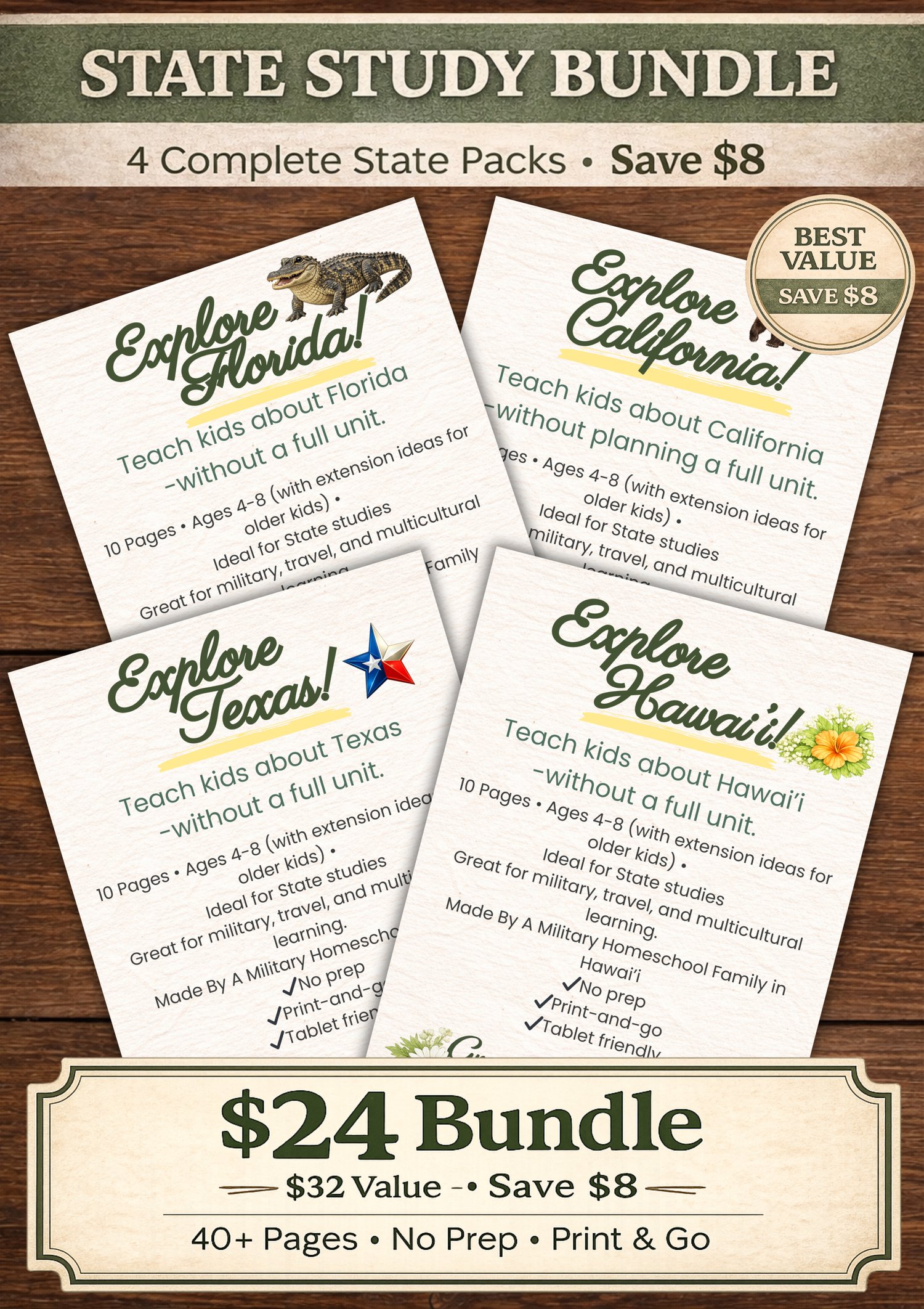 This State Study Bundle includes 4 complete, ready-to-use state activity packs designed for ages 4–8 — perfect for homeschool families, elementary classrooms, military families, and travel lovers.