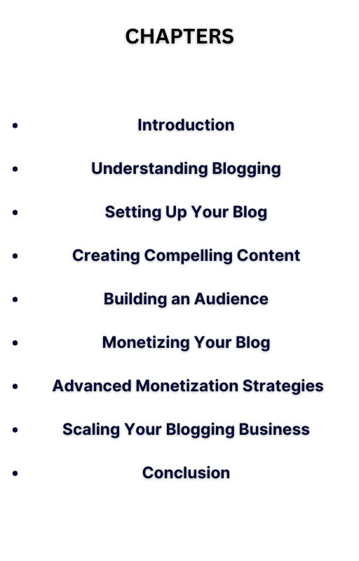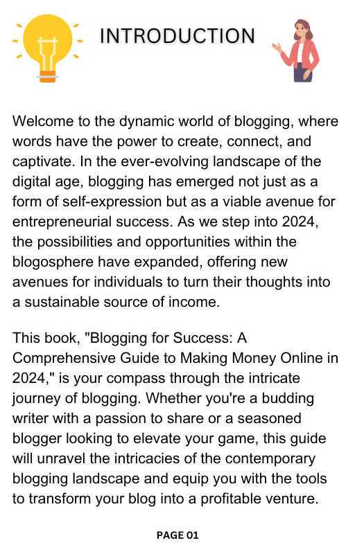 In the ever-evolving digital landscape of 2024, blogging has transcended its roots as a simple online journal to become a powerful platform for personal and financial growth. If you've ever dreamt of turning your passion for writing into a lucrative online business, "Unleashing Success" is the guide you've been waiting for. This comprehensive book, crafted with the latest insights and strategies, takes you on a journey from understanding the fundamentals of blogging to advanced techniques for monetizing and scaling your blogging business.