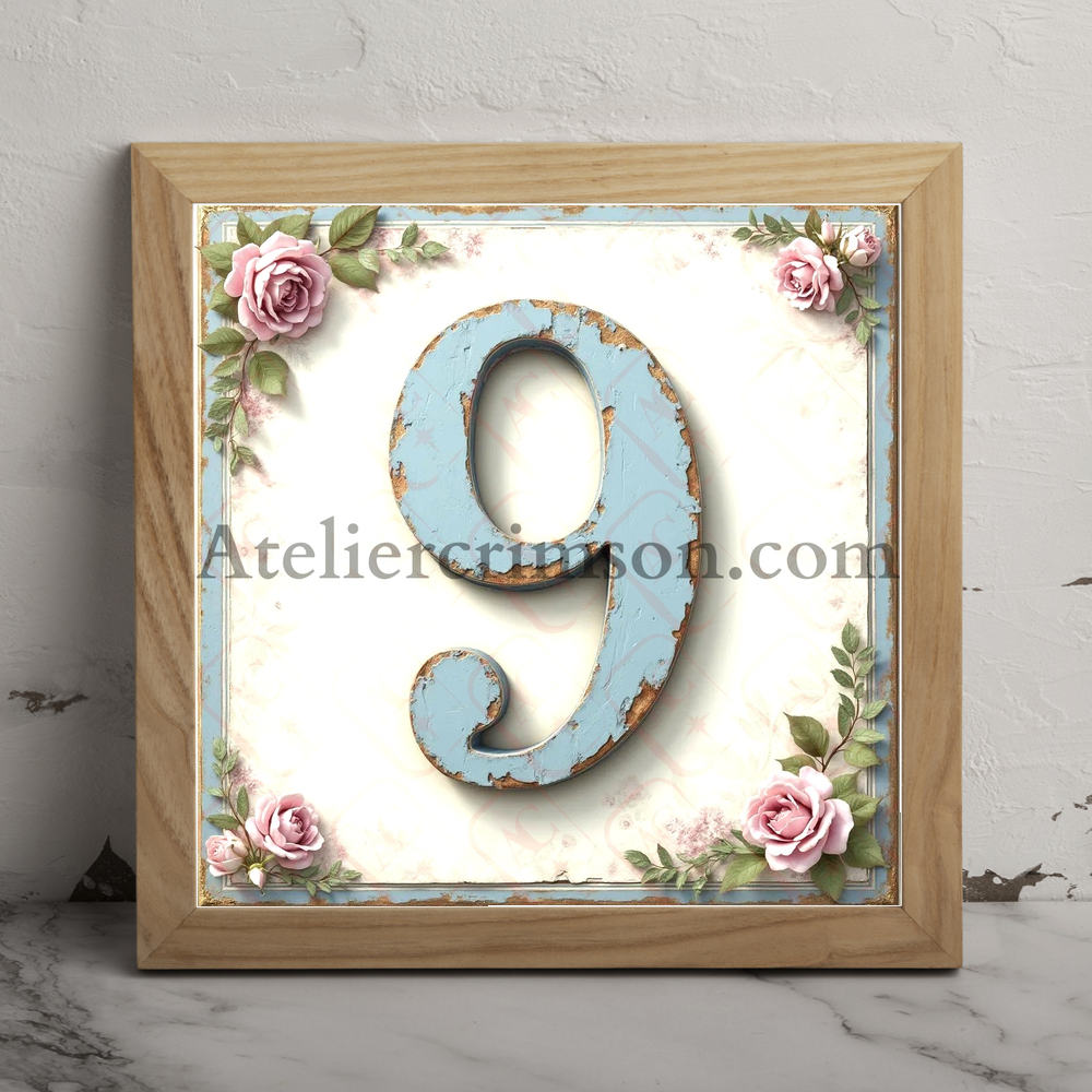 Number 9 shabby chic blue a work of art in soft pastel blue. These elegant characters, reminiscent of weathered painted wood, stand out against a delicate off-white background with subtle floral accents. Perfect for vintage-inspired home decor, DIY projects, or creating unique, personalized gifts with a touch of timeless elegance.