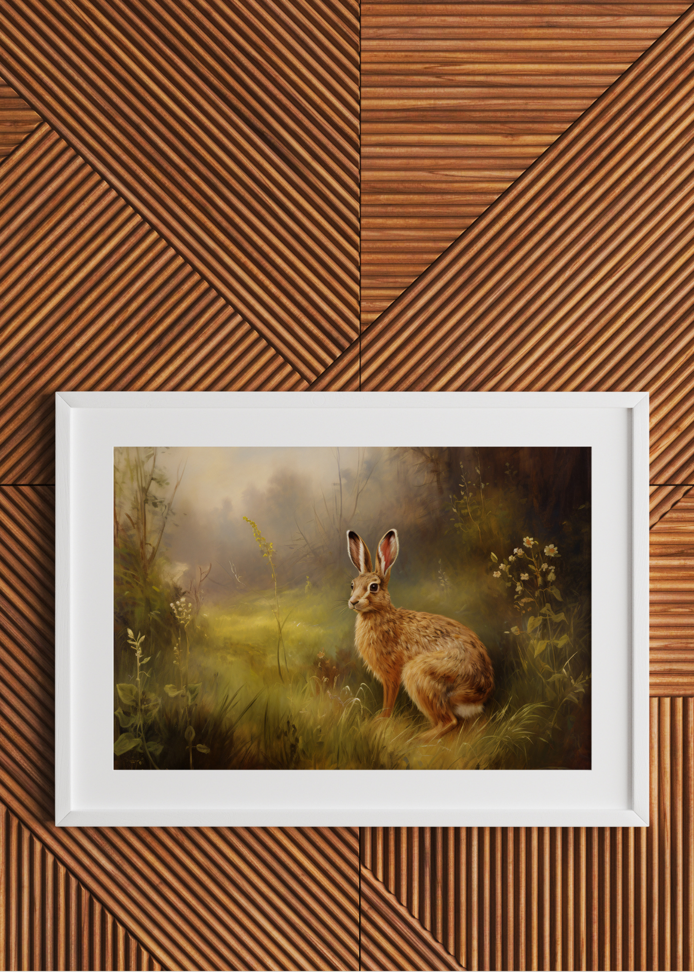 Into the Thicket— Bathed in golden green light, this hare gazes softly from a forest clearing, surrounded by delicate flowers and tall grass. The setting is dreamy and dappled, as if caught in that magical moment just before twilight settles in. Shadows stretch gently behind the trees, and the air seems to glow with quiet magic. It’s a piece for forest lovers and secret keepers—a reminder that even in shadowed places, beauty blossoms.