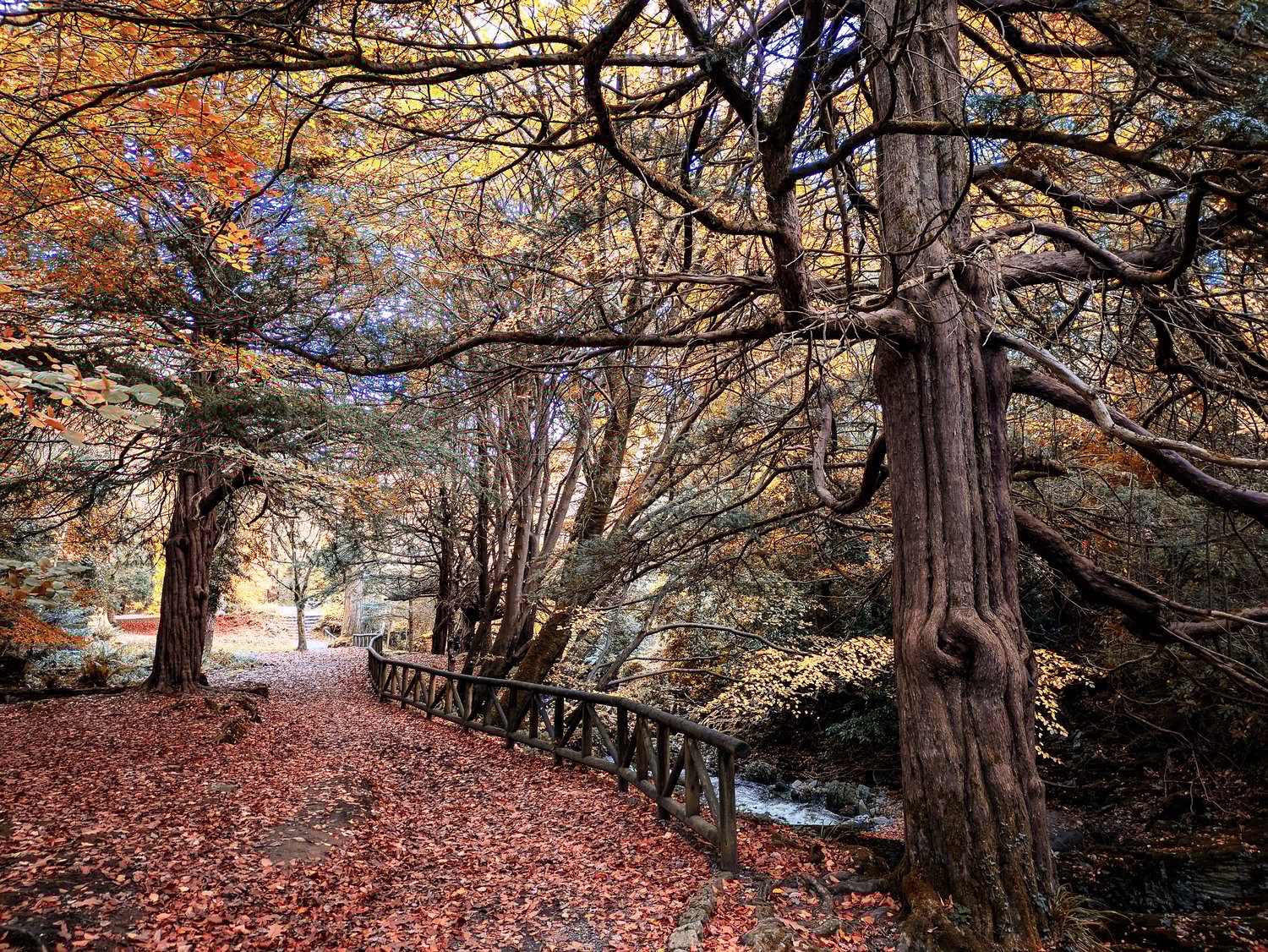 A leaf-covered path winds through tall trees in full autumn colour, with a simple wooden bridge guiding the way forward. It’s the kind of path that encourages wandering without hurry.
