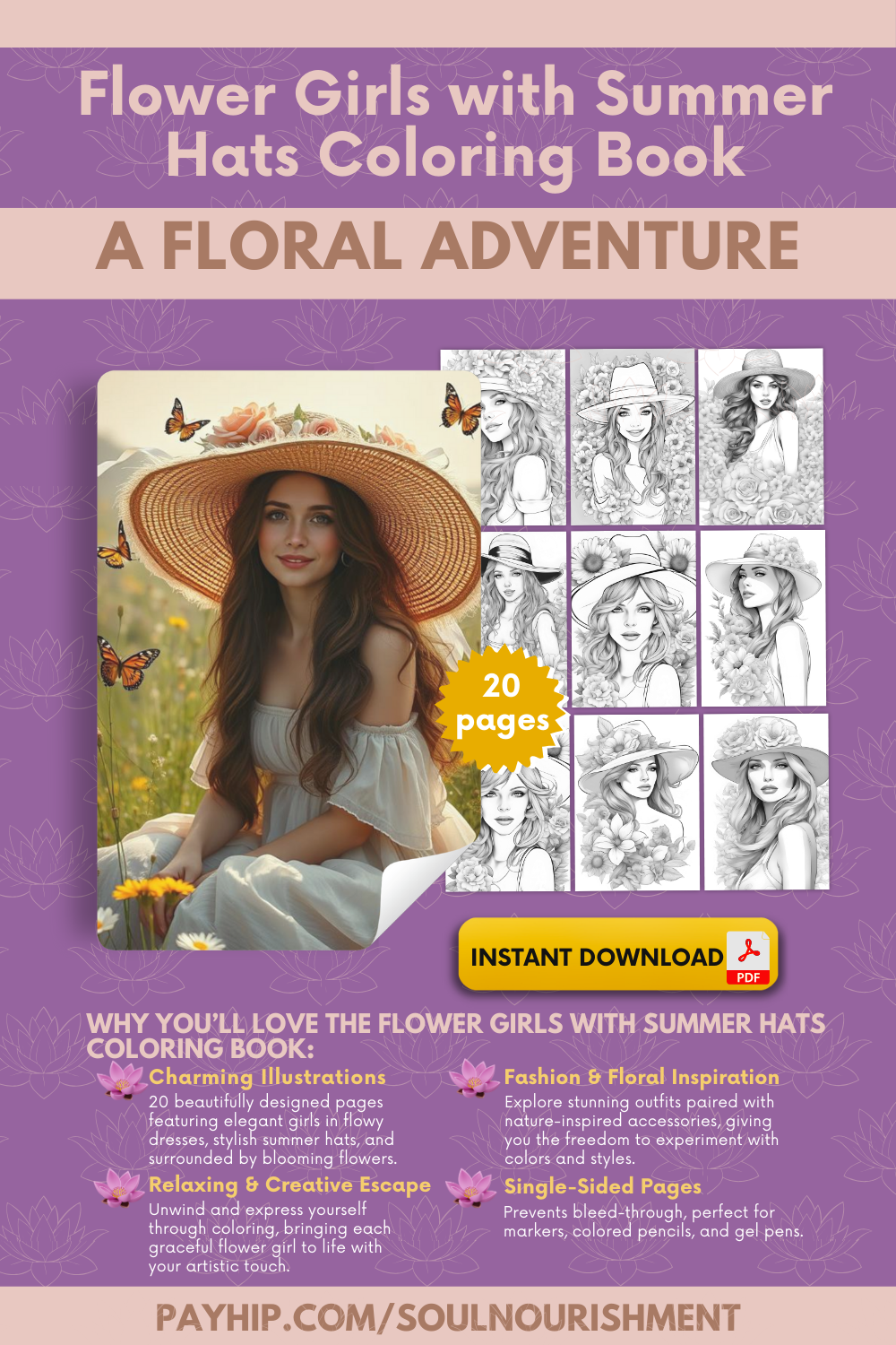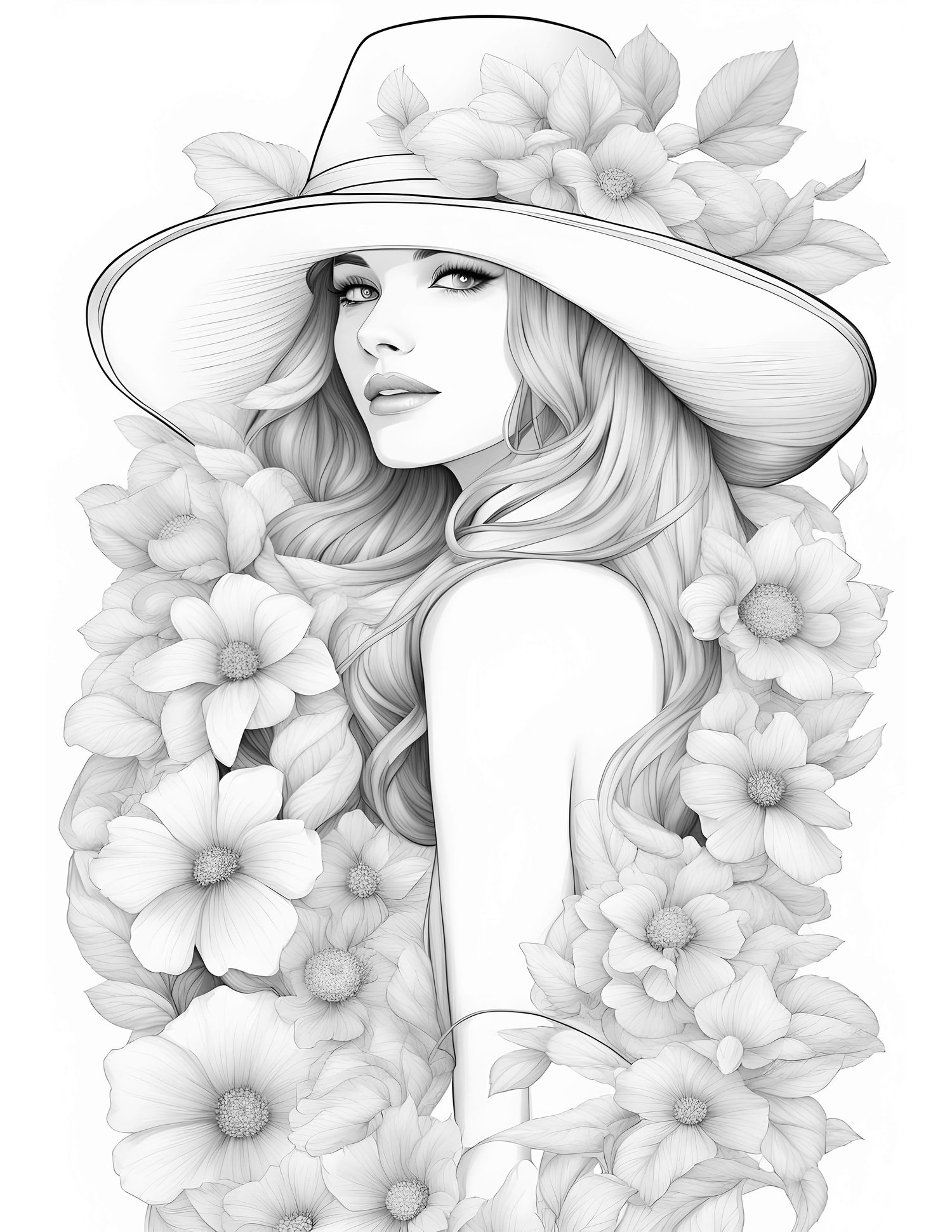 - Lovely Illustrations: Enjoy 20 beautifully designed pages showcasing girls in flowy dresses, wide-brimmed hats, and surrounded by blooming flowers. Each illustration captures a unique essence of summer and femininity.