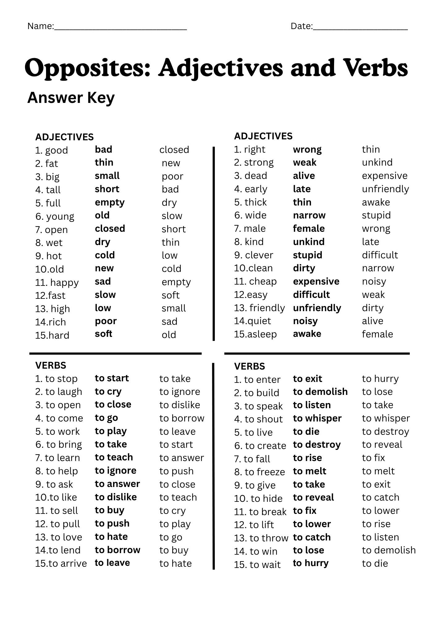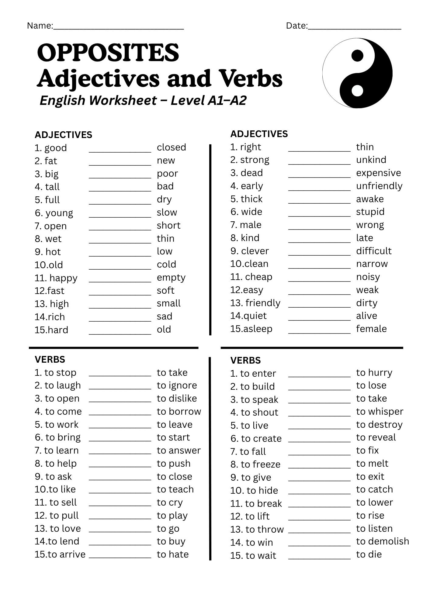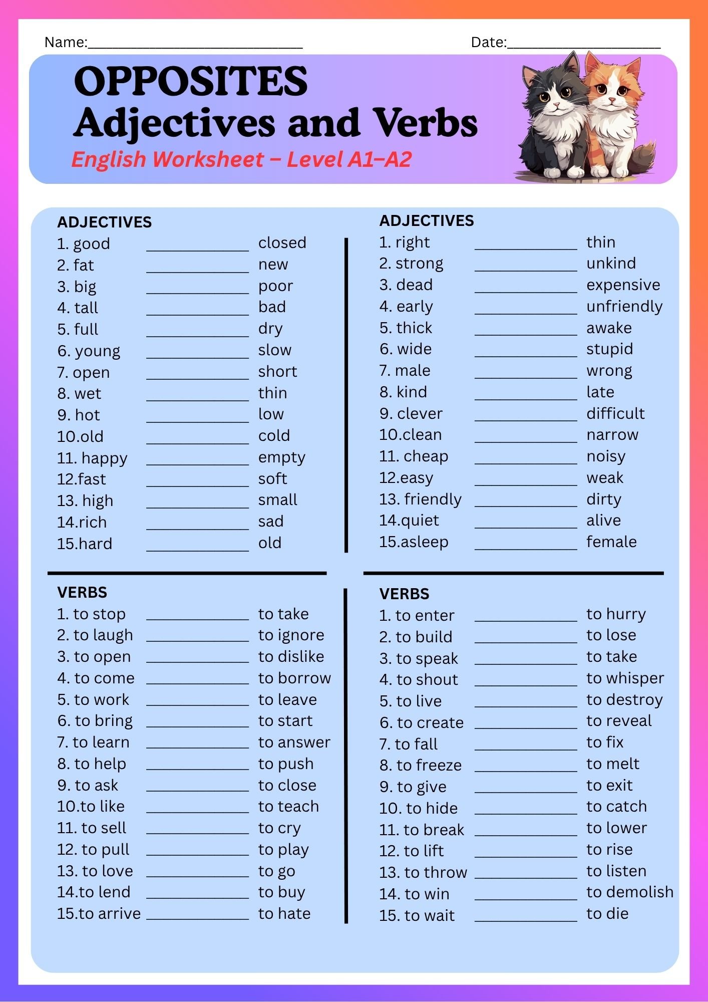 Opposites Worksheet for A1-A2 Learners – 30 Adjectives & 30 Verbs
