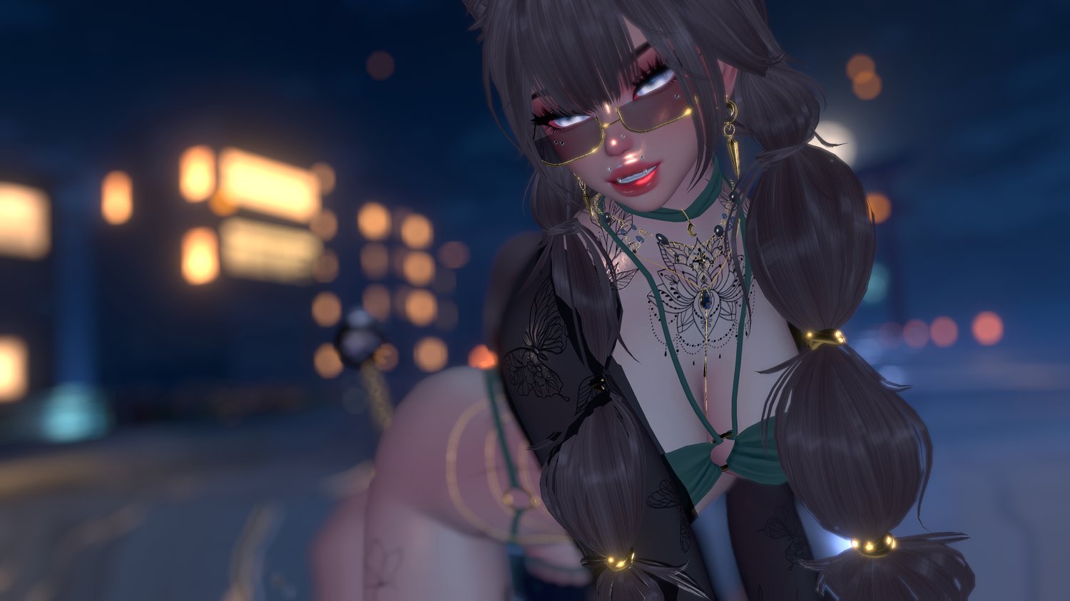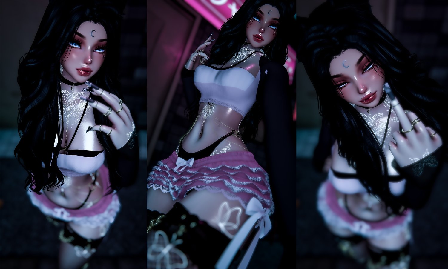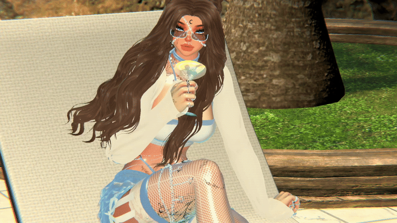 long hair(@Nessy!), braided hair(@Saikura), bikini set(@ares.olympus), necklace and ear cuff(@swayzhee), moon earrings, garter(@safie), harness(@Aantara), shoe moons, head moon(@chocobunny), top(@coyuette), glasses, shorts, fishnets(@zinpia)