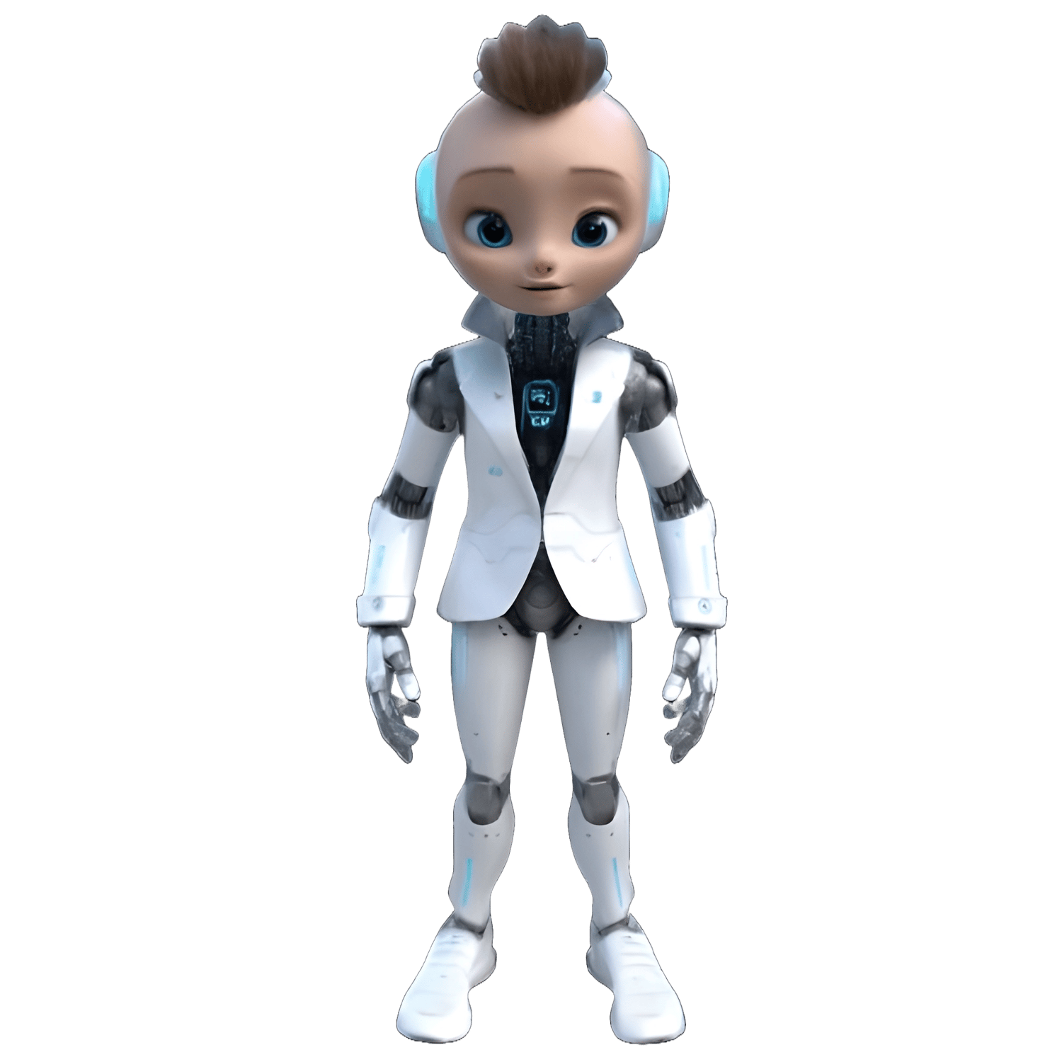 - A friendly-looking robot character in a white suit with blue accents and distinctive hairstyle (top center)