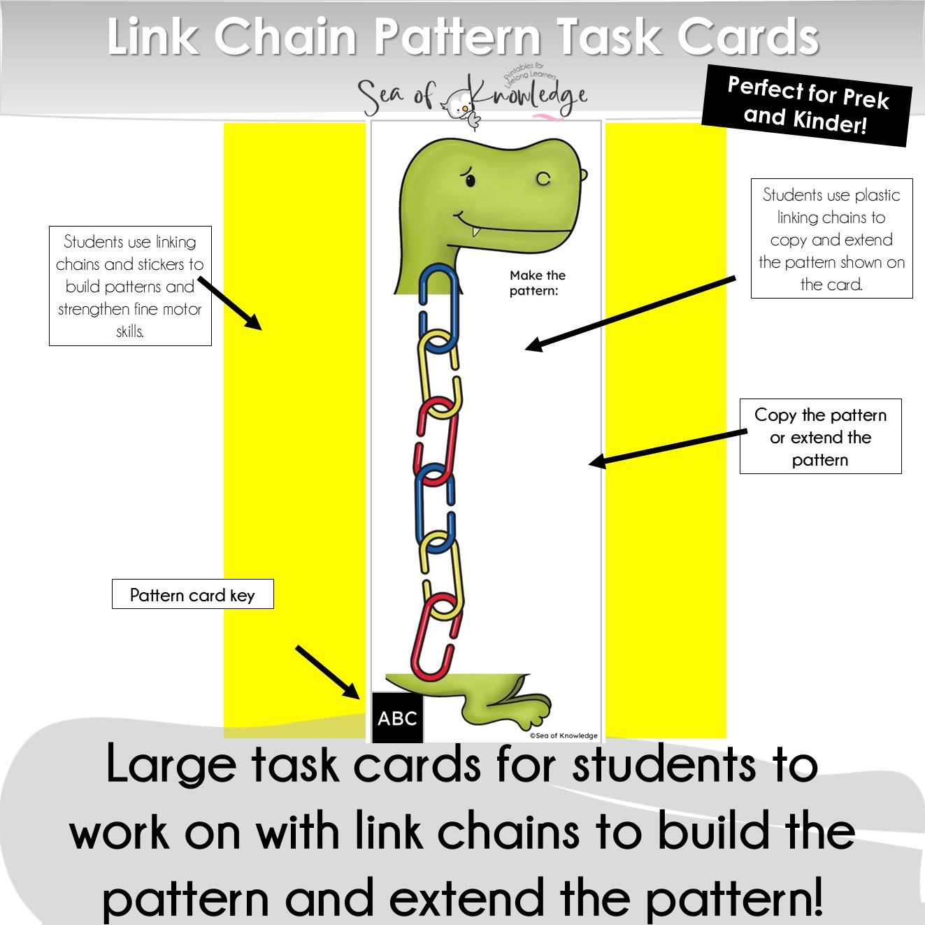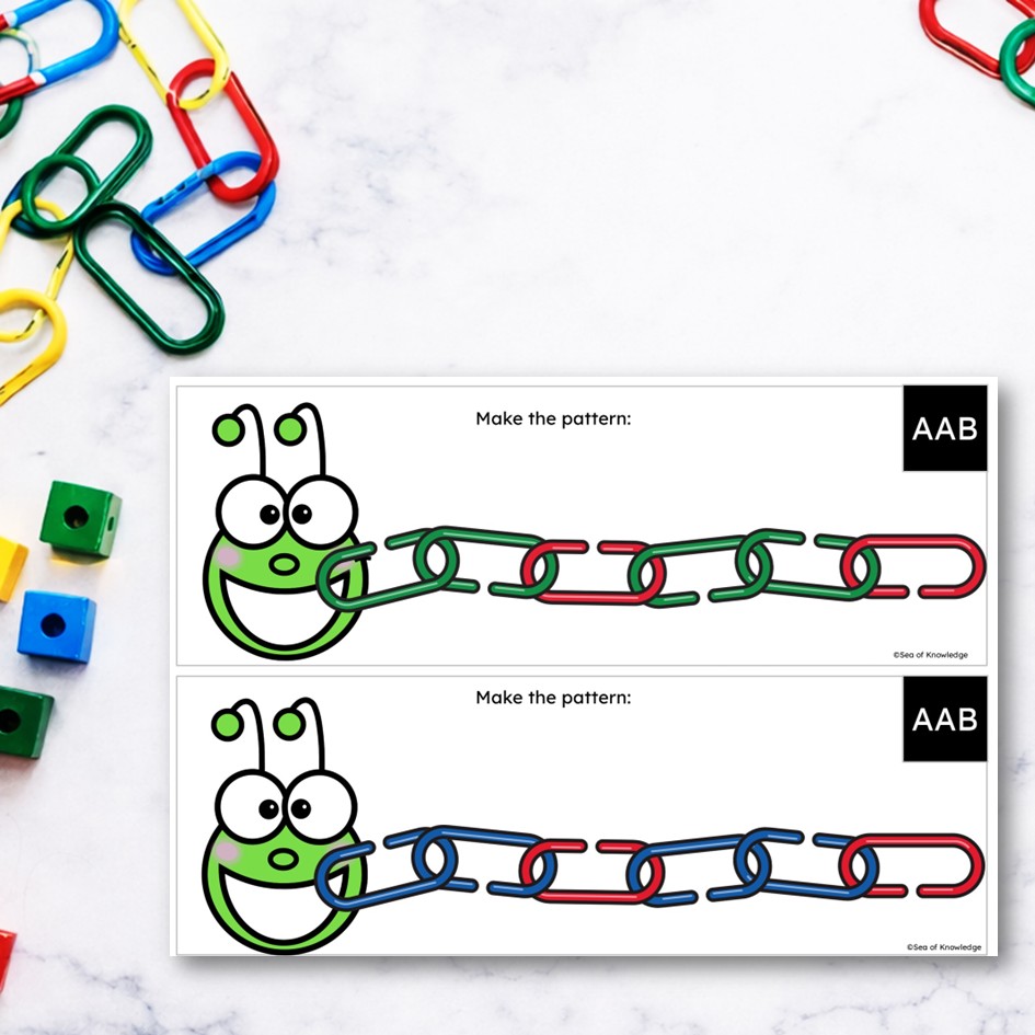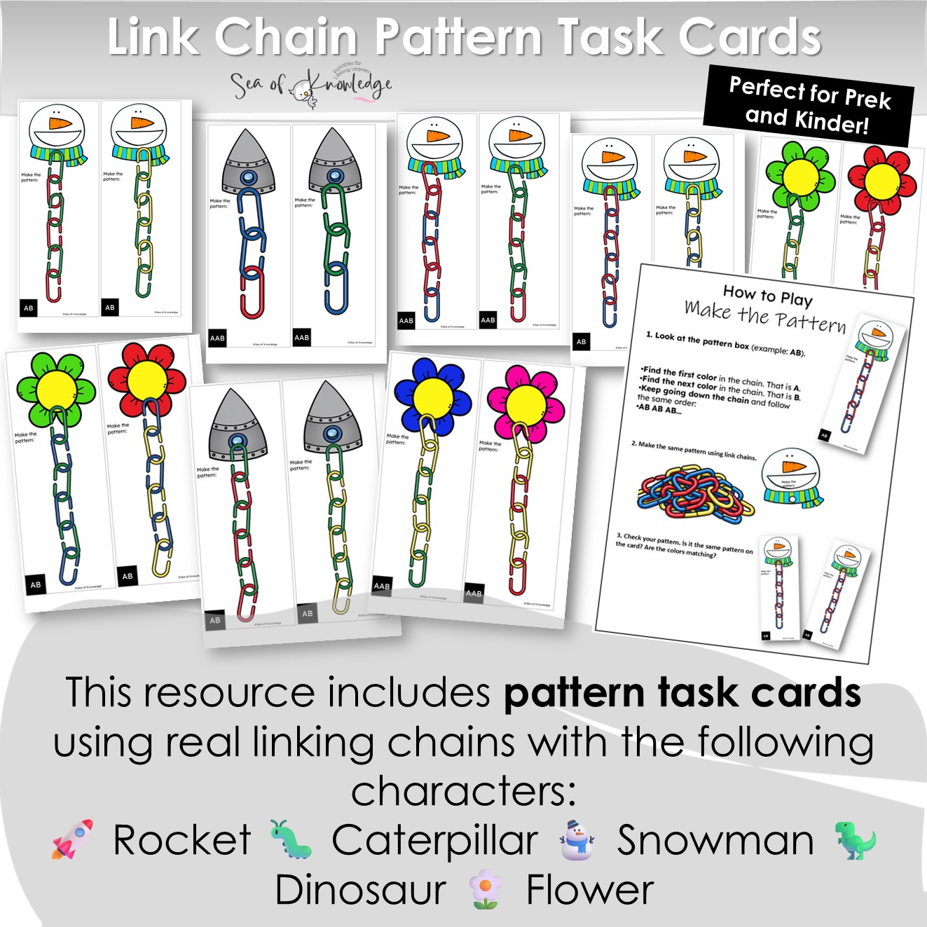 These Linking Chain Pattern Task Cards are designed for young learners to see, build, and extend patterns using plastic linking chains. Each card features a fun character topper that naturally builds lengthwise, making patterning visual, concrete, and easy for students to understand.