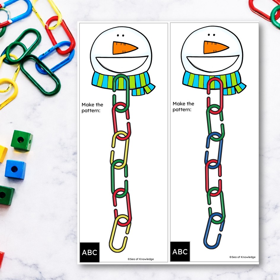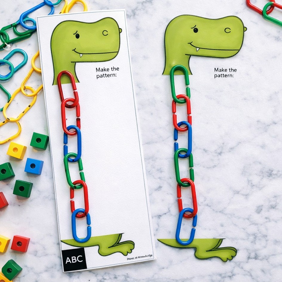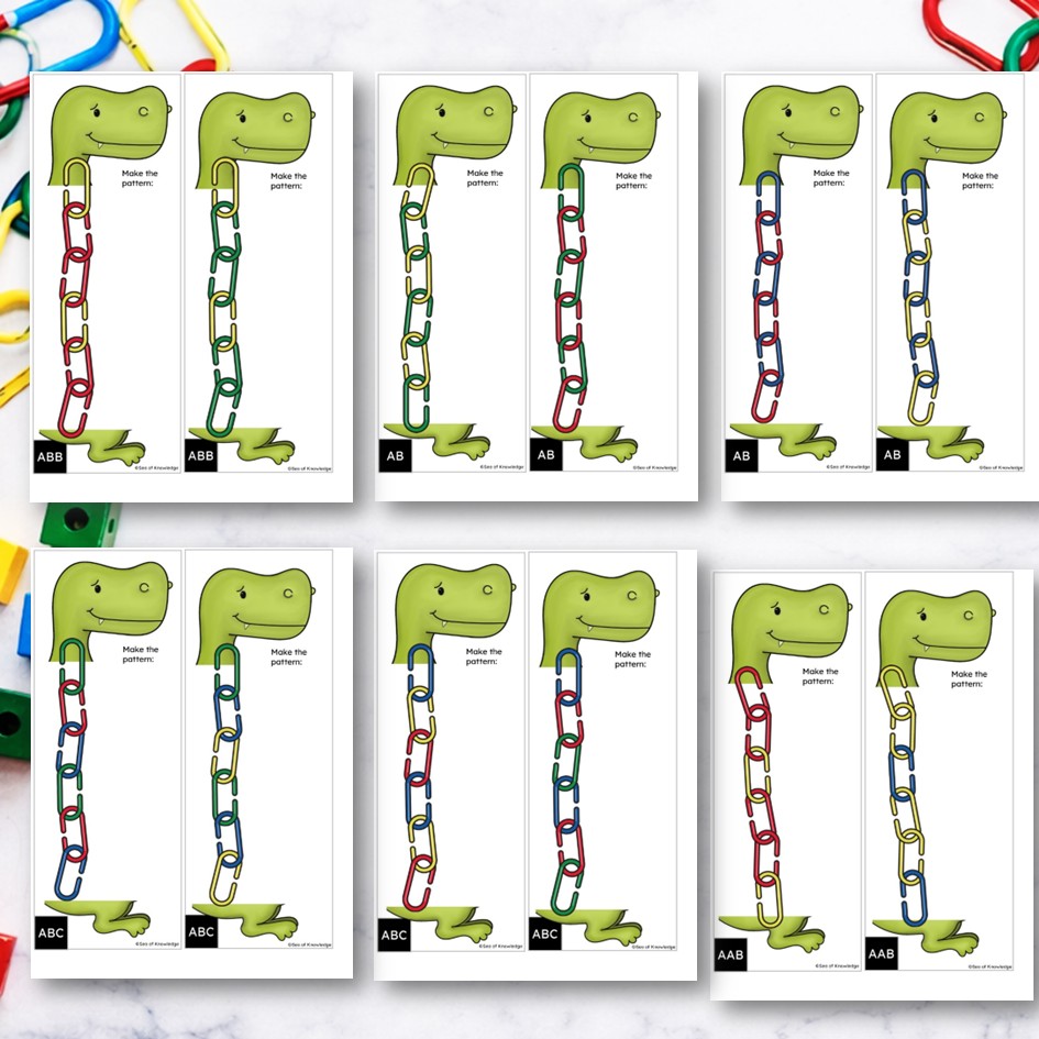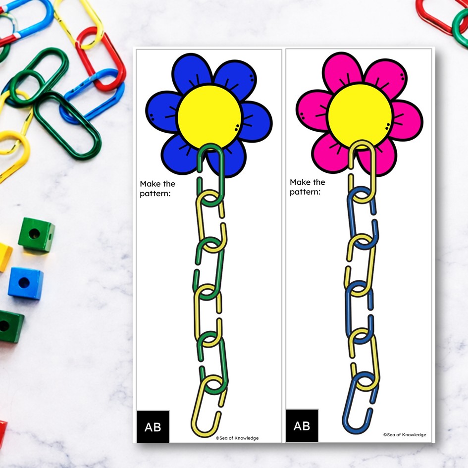 These Linking Chain Pattern Task Cards are designed for young learners to see, build, and extend patterns using plastic linking chains. Each card features a fun character topper that naturally builds lengthwise, making patterning visual, concrete, and easy for students to understand.