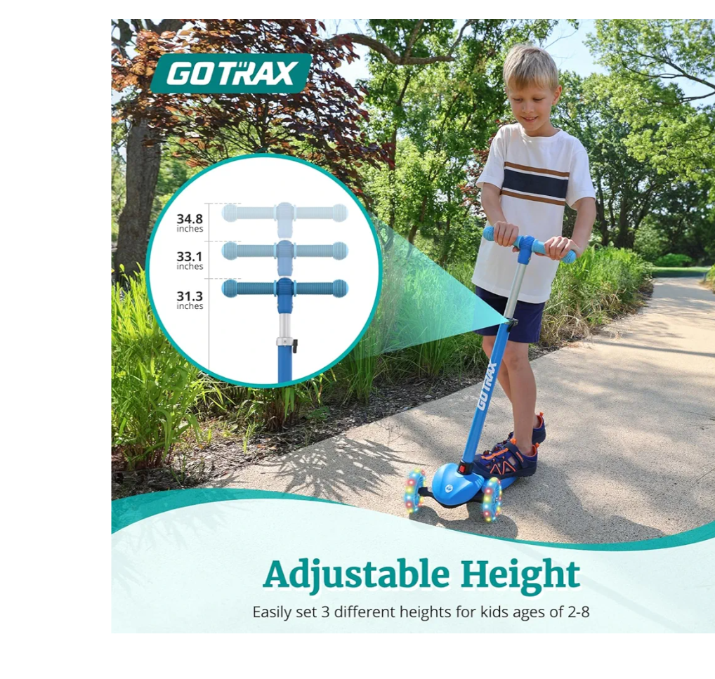 EXCELLENT SERVICE: Gotrax offers a 1-year manufacturer's assurance, providing assurance that your Gotrax KS1 kid's scooter is built to last. Any questions, please contact us at any time and we're haGotrax KS1 Kids Kick Scooter, LED Lighted Wheels and 3 Adjustable Height Handlebars, Lean-to-Steer & Widen Anti-Slip Deck, 3 Wheel Scooter for Boys & Girls Ages 2-8 and up to 100 LbsItem Dimensions L x W x H 22"L x 11"W x 30"H