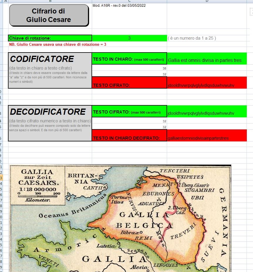 Il foglio di calcolo per la crittografia a scorrimento è una ricostruzione storica funzionante, trasposta su Excel, del cifrario di Giulio Cesare citato da Svetonio. Il foglio di calcolo è senza password o protezione, in modo da poter essere visionato liberamente per intero. Il documento potrebbe anche essere usato per scopi professionali però si avverte che la tecnologia utilizzata potrebbe cedere ad una indagine con un software di crittanalisi.