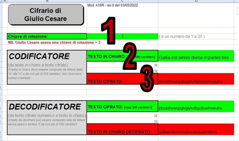- Calcolo - Il foglio "Calcolo" è il motore del cifrario. Presenta delle celle verdi dove si devono inserire dati e delle celle rosse dove si può vedere e copiare il risultato. Una volta inserita la chiave, a seconda se si deve codificare o decodificare il messaggio, si inserisce nelle celle verdi il messaggio e si ottiene nelle celle rosse il risultato. Il cifrario fu realizzato solo per le lettere a-z, non vengono calcolati simboli, numeri o spazi. La lunghezza del messaggio è di 500 caratteri e la chiave è un numero da 1 a 25.