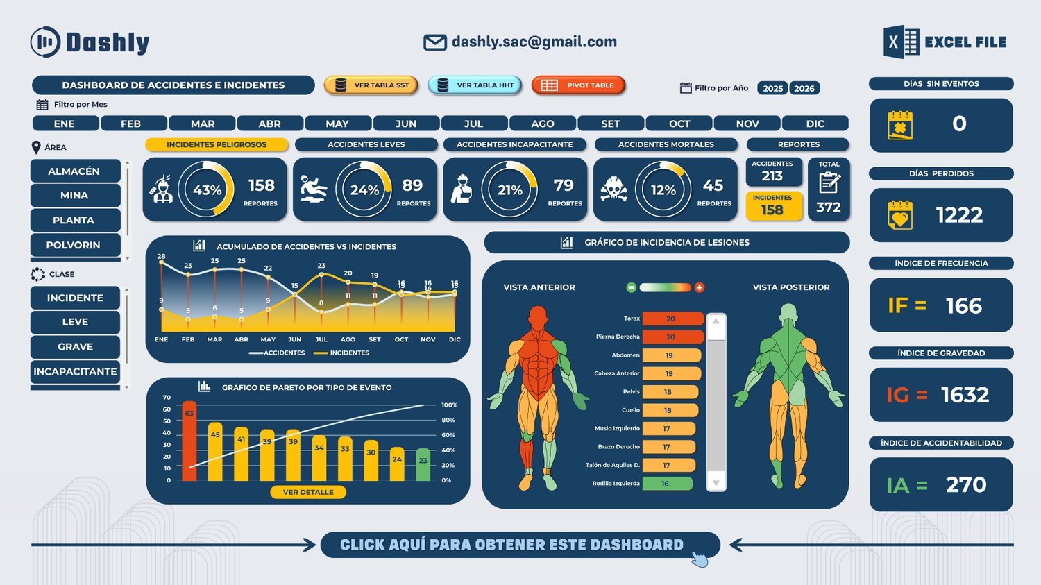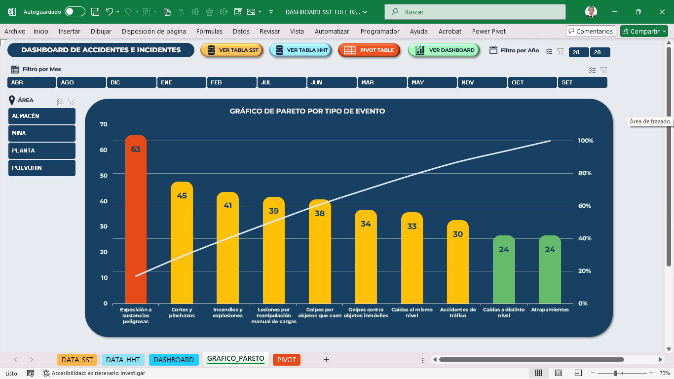 - Filtros dinámicos por mes, área o zona, y clase de evento (incidente peligroso, accidente leve, grave o incapacitante).