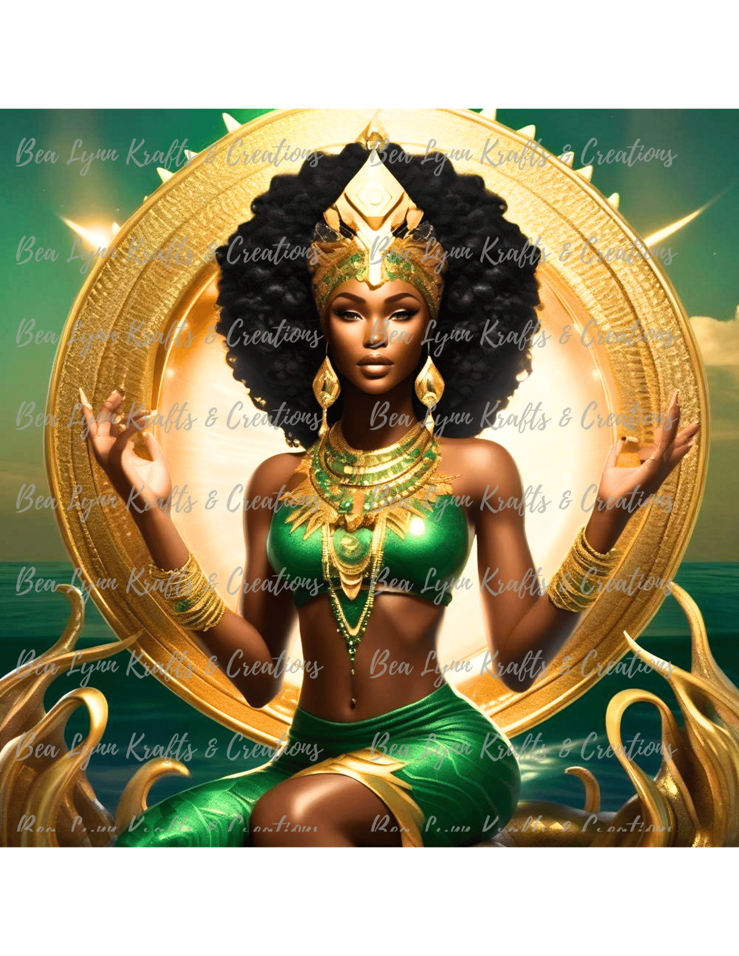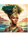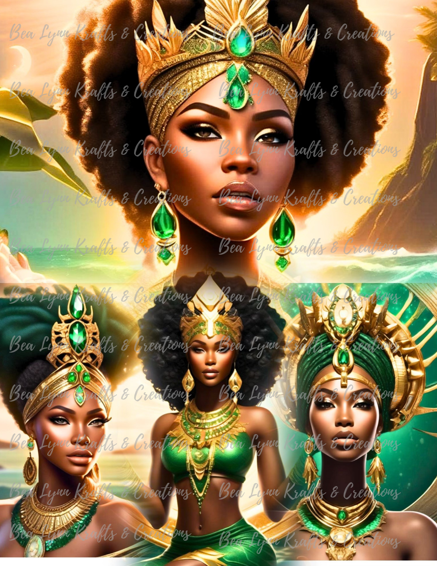Embrace the beauty and power of African royalty with this stunning collection of four transparent PNG images. Each image features a regal Afrocentric queen adorned in vibrant green and gold, showcasing intricate details from majestic crowns to elegant jewelry. These digital art pieces are perfect for adding a touch of royalty and empowerment to your projects.