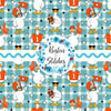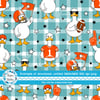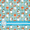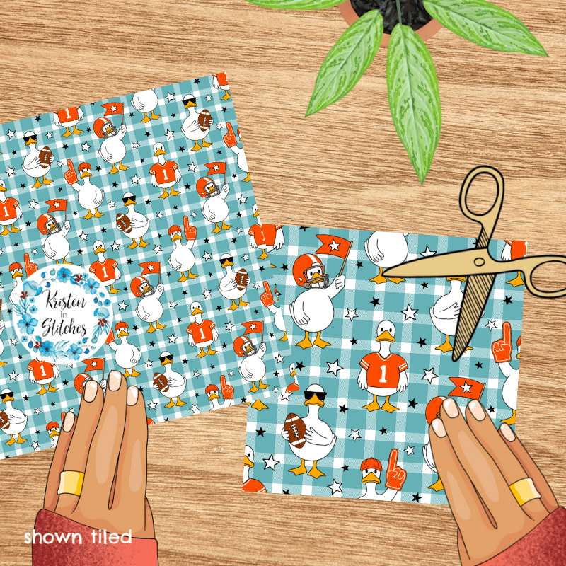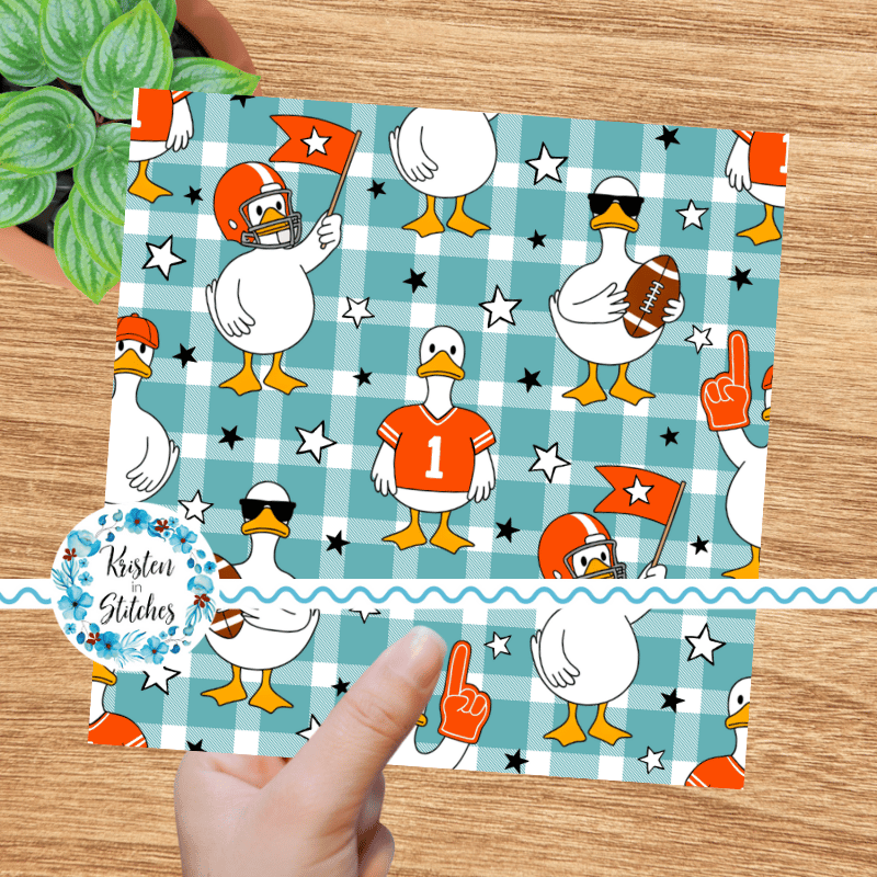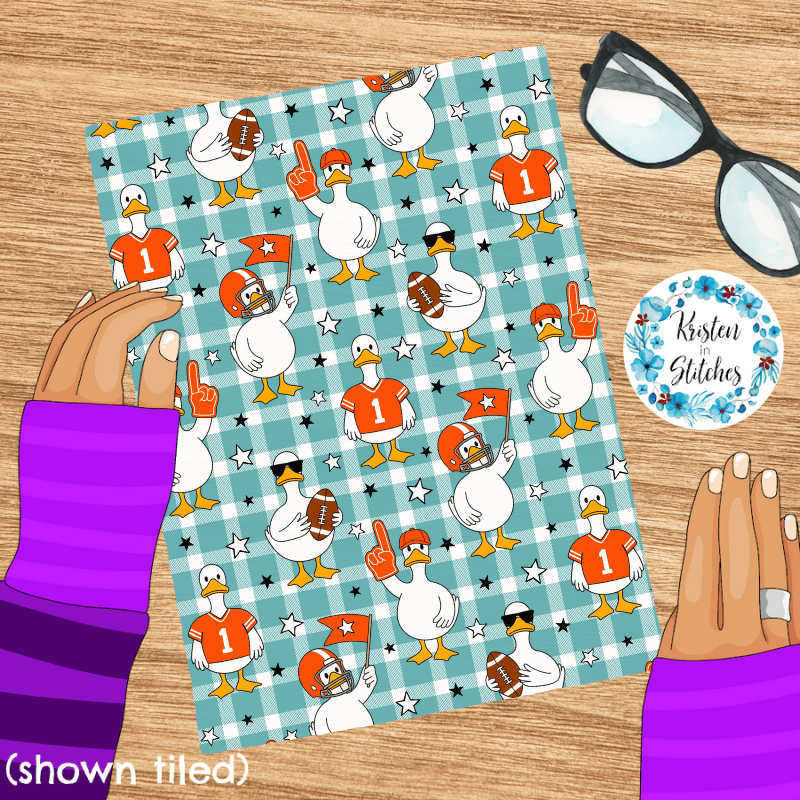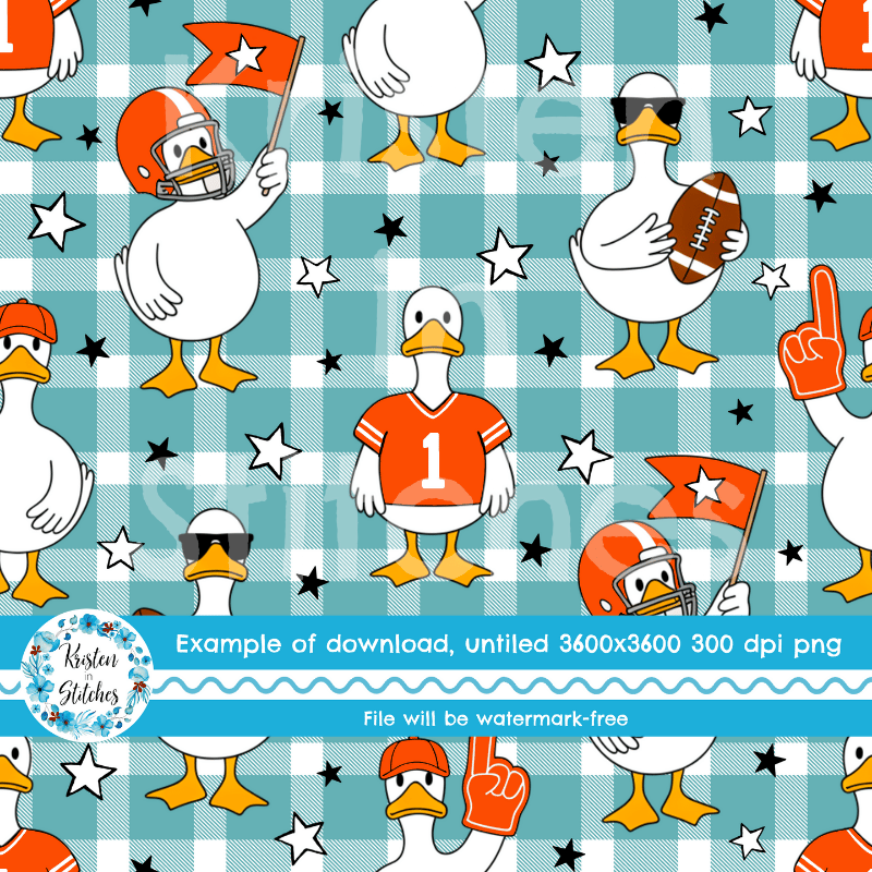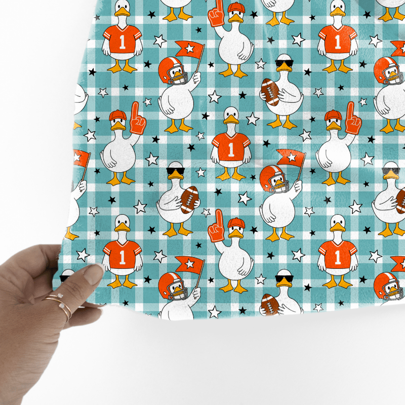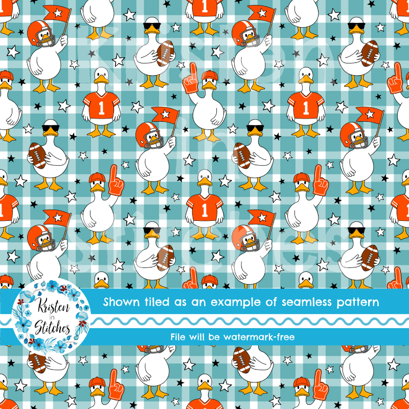 White geese ready for game day! Orange jerseys, helmets, flags and footballs on aqua blue gingham plaid.