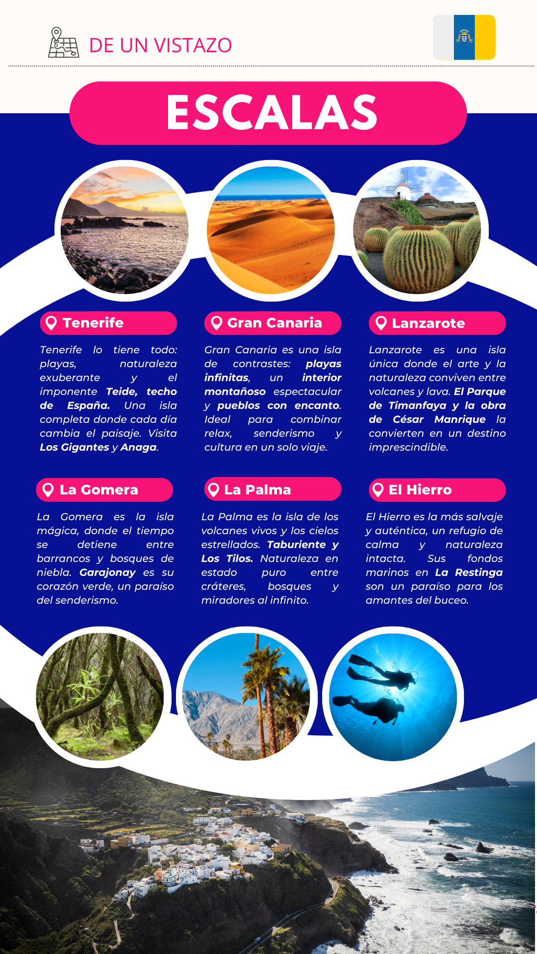 Porque te ahorrará tiempo en la planificación, te evitará errores típicos y te permitirá vivir una experiencia más auténtica y organizada por el archipiélago. Ya sea tu primera vez en Canarias o una visita más, tendrás en la palma de tu mano una herramienta útil y práctica. Hemos incluido lo fundamental de todas las islas.