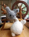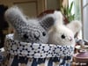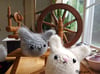 I have a fluffle of Angora Rabbits. In the maximum fuzz state, they look like a loaf of fur with ears. I wanted to create a very easy beginner crochet pattern, and the simplistic dumpling loaf shape of a hairy rabbit is perfect. Yarn is “fuzzed” after to create the angora rabbit halo.