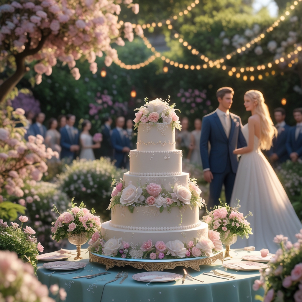 “A beautiful outdoor wedding scene set in a lush garden filled with blooming flowers and soft sunlight. A stunning multi-tiered wedding cake sits elegantly on a decorated table, adorned with delicate floral arrangements and intricate icing details. The bride and groom stand nearby, surrounded by elegantly dressed guests, twinkling fairy lights, and soft pastel decorations. The scene captures a romantic, joyful atmosphere with ultra-realistic details, warm lighting, and a dreamy, cinematic quality.”
