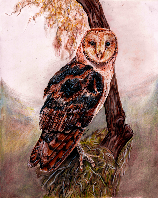 "Perch of Secrets" depicts a barn owl resting on its nest, framed against the faint memory of a tree in the background. The soft fading of the setting draws attention to the owl itself-- watchful, still and mysterious. Often seen as a symbol of wisdom and hidden knowledge, the owl here becomes a quiet guardian of untold stories.