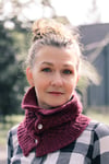Yarn: Oh! from HiKoo by Skacel (100% super baby alpaca; 191 yards/175m/100g); 1 skein shown in Baby, or 185 yards of alpaca bulky weight yarn. The sample as written used approximately 185 yards.