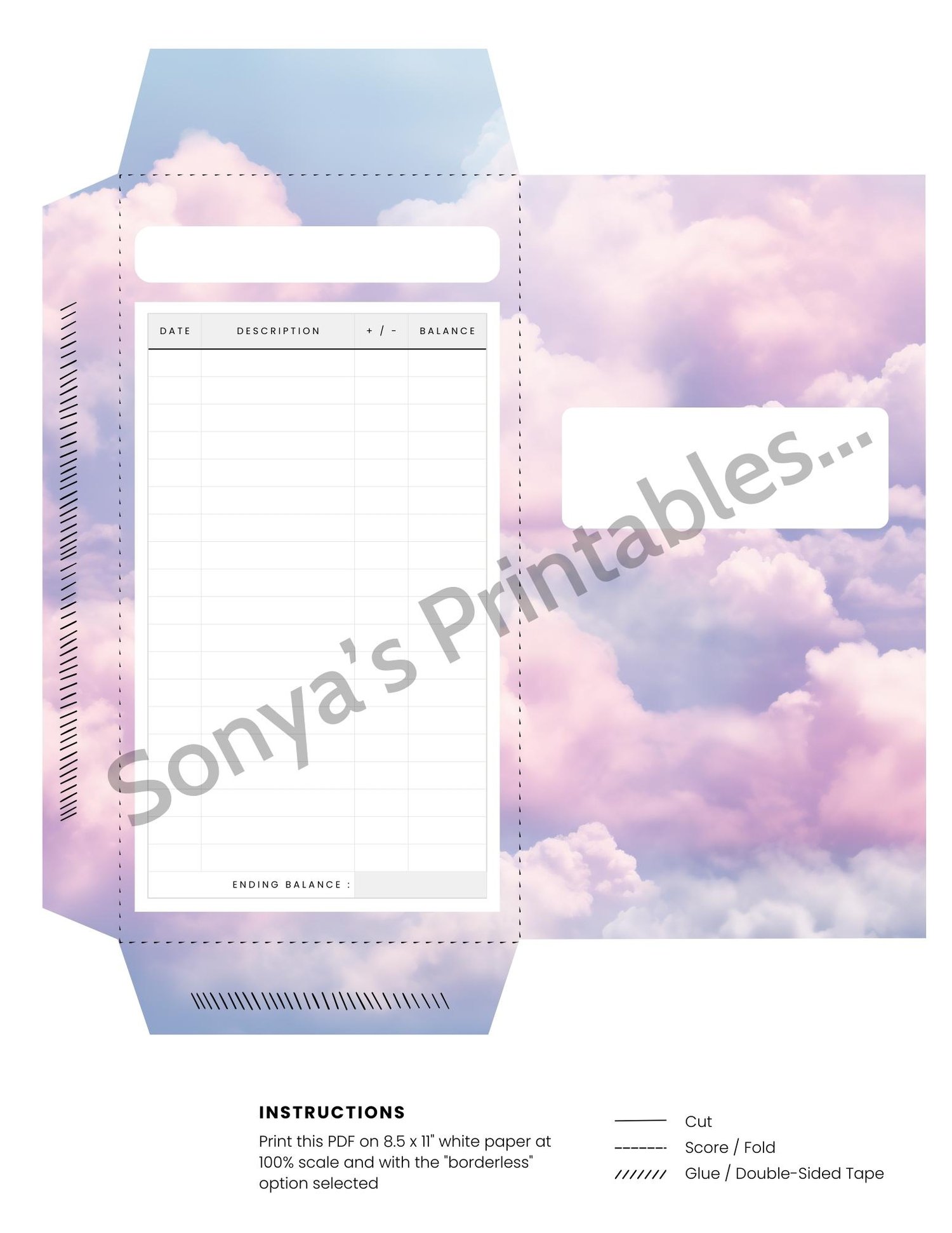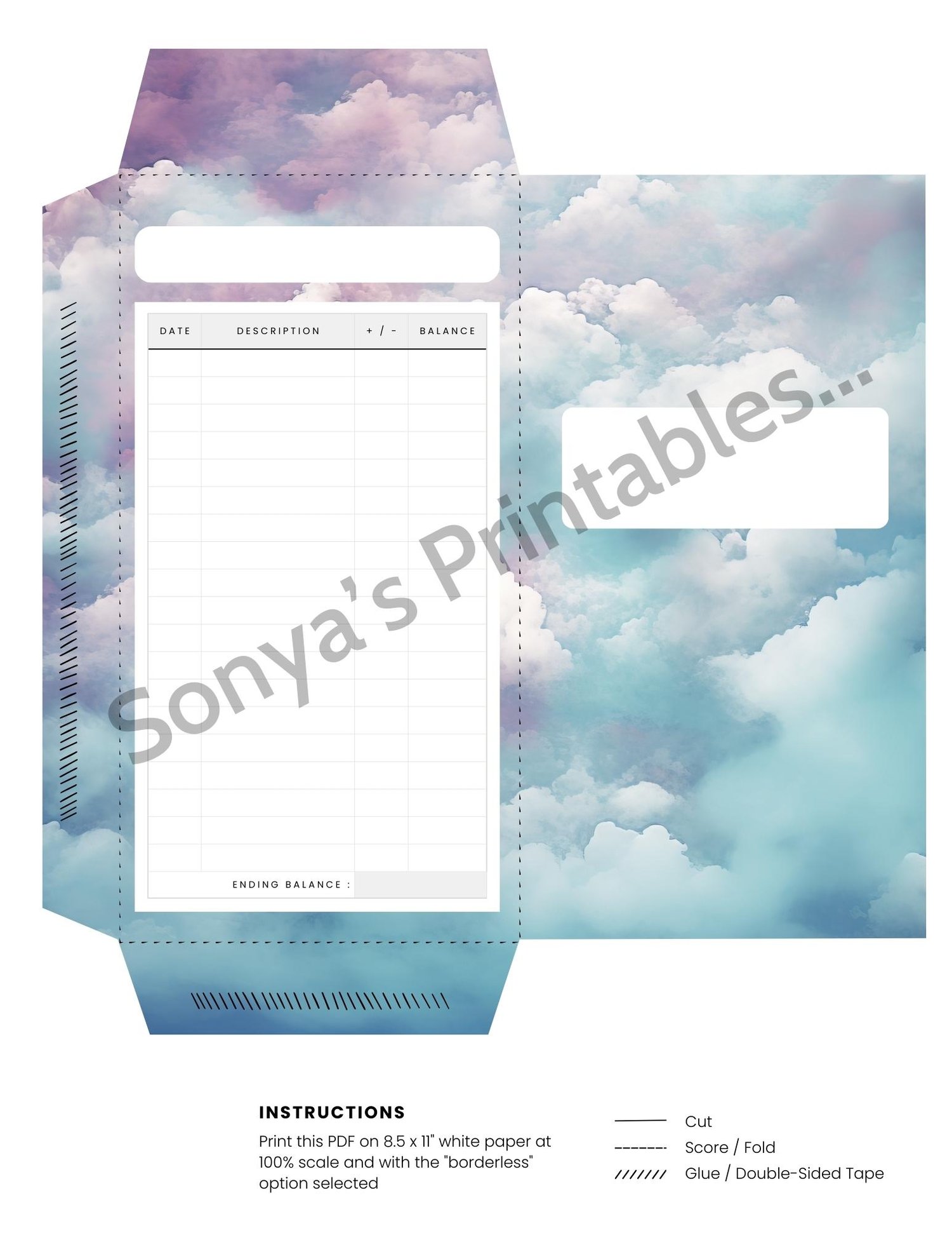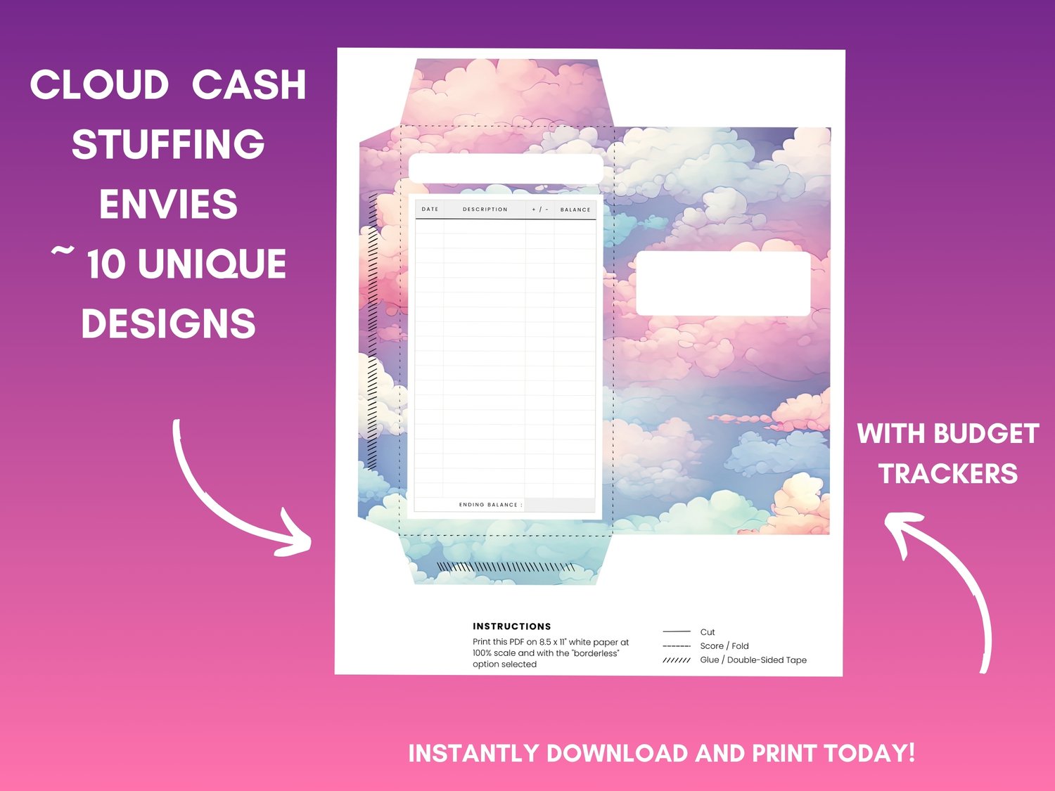 Stay on budget with these 10 pastel-colored cloud cash envelopes! Each comes with a fun and easy-to-navigate expense tracker, so you can be sure you're staying in the 🌈! Plus, you'll get the satisfaction of physical stuffing, so you know you're really using your 💰 responsibly. It's your bank account's dream come true!🙌 Order these Cash Stuffing Envies today! It's a very easy-to-follow printable template. Just print, cut and glue (or tape).